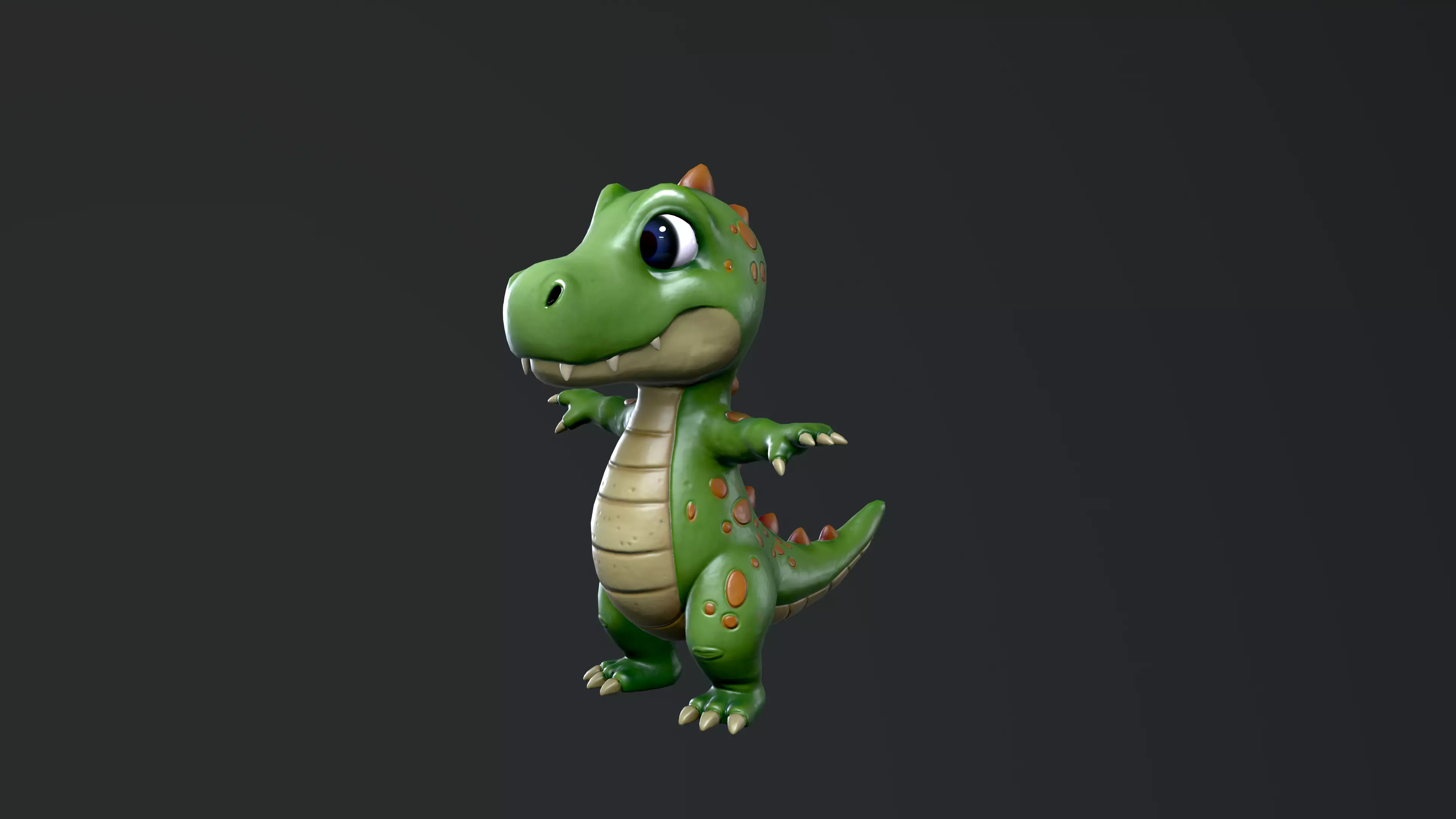 Meet this adorable, stylized baby dinosaur, perfect for mobile games, VR/AR projects, or educational apps. This character features a vibrant green skin texture with orange spots and a friendly, expressive face that will appeal to a wide audience.