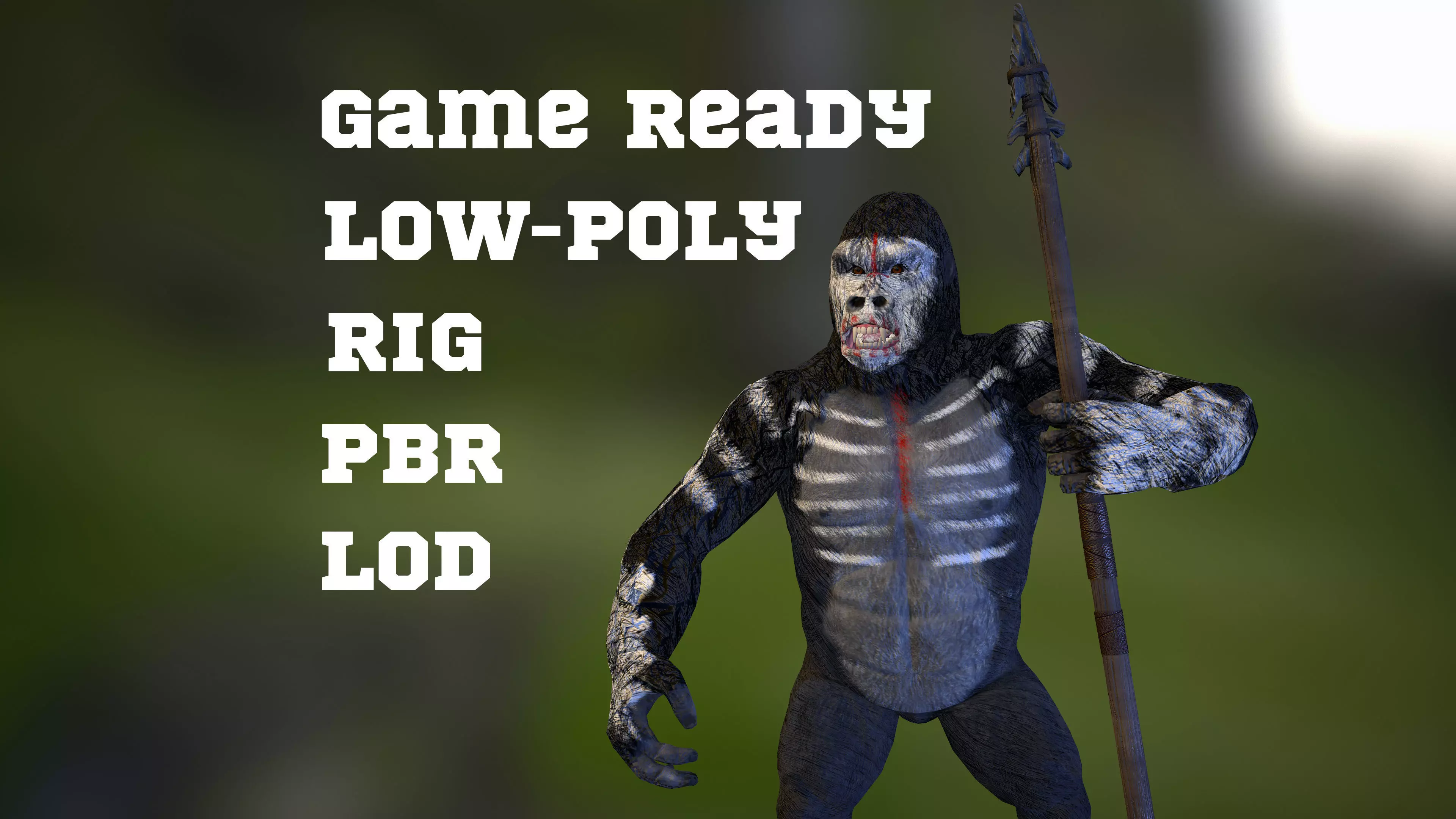 Gorrila warrior with weapons game ready model with pbr textures this is a high quality model that will add realism to your projects. Fully detailed, textured model. Comes with detailed textures, weapons and 3 lod.