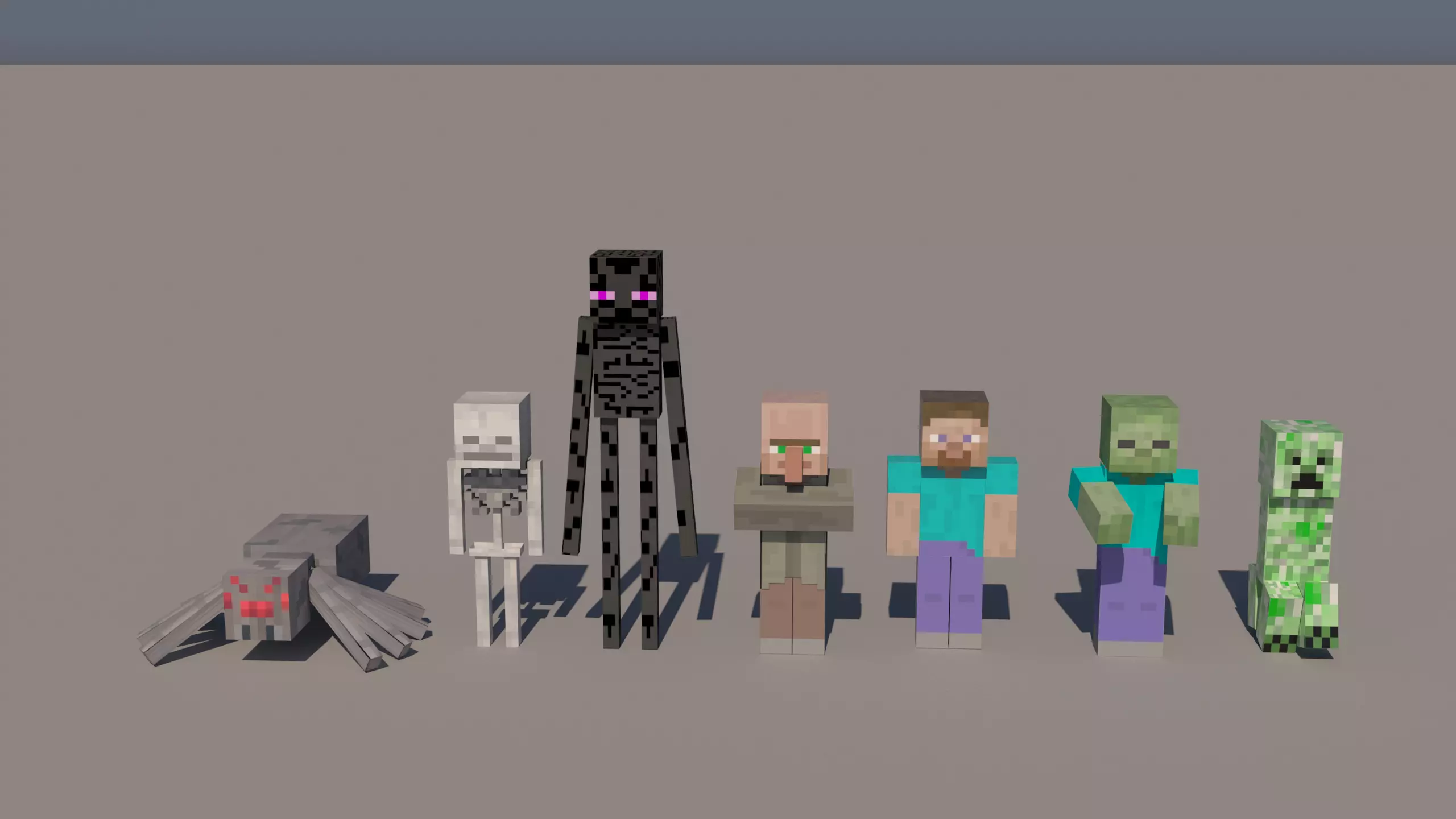 This is a collection of high-detail 3D models of iconic Minecraft characters. Each model is crafted with great attention to detail while preserving the original Minecraft style. The collection includes - Enderman, Zombie, Skeleton, Spider, Steve, Villager, and Creeper.Each model is also available for individual purchase at $3, which means the full set would normally cost $21. However, by purchasing the complete collection, you save $13, making it a cost-effective bundle for creators, animators, and Minecraft fans alike.