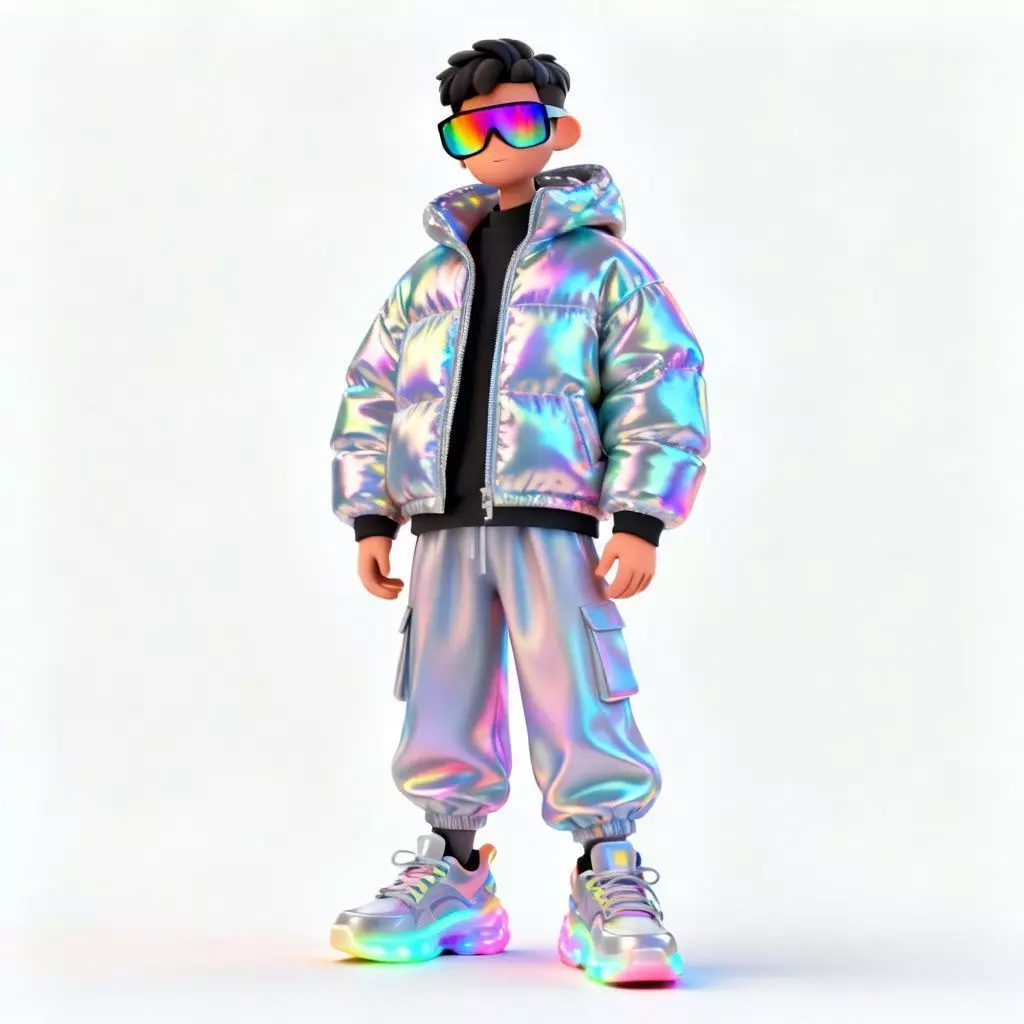 The Overall Concept This character is a stylized, cartoon-proportioned avatar designed for the metaverse or a virtual social platform. It focuses heavily on futuristic hypebeast fashion, featuring a trendy, high-tech outfit that demands attention.