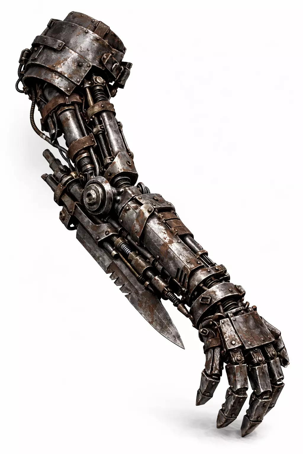 Mechanically, the arm showcases pistons, tubing, rotary joints, and segmented finger articulation. These details support believable animation rigging for grasping, punching, or blade extension sequences. The industrial wear and subtle rust variations add authenticity, reinforcing the concept of a well-used battlefield prosthetic rather than a pristine sci-fi limb.