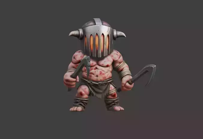 Ironhelm Berserker is a highly expressive stylized 3D character that captures raw brutality, primitive strength, and dark fantasy atmosphere in a compact yet powerful form. This model represents a savage gladiator or dungeon-born warrior, clad in a heavy iron helmet with glowing slits and wielding a brutal hooked weapon designed for close-quarters carnage. Its exaggerated proportions and bold silhouette make it instantly readable and visually striking, even at a distance—perfect for games that prioritize clarity and strong character identity.