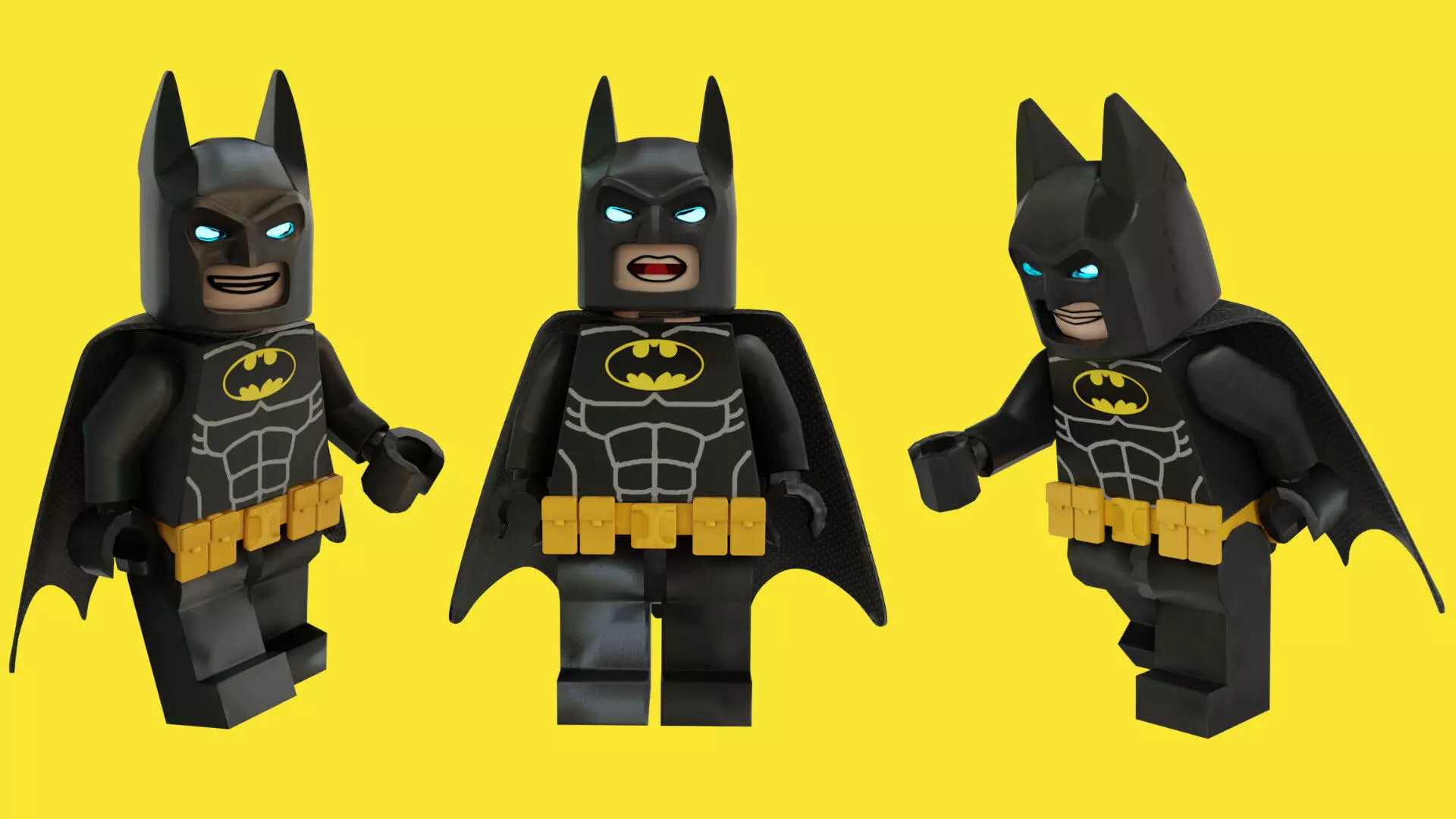 A high-quality 3D model of the iconic Batman character rendered in the distinctive LEGO Minifigure style. This model captures the look of the classic Dark Knight suit, featuring a black cowl, cape, detailed torso printing showing muscle armor, and the signature yellow utility belt. The eyes are rendered with an intense blue glow effect (easily adjustable).
