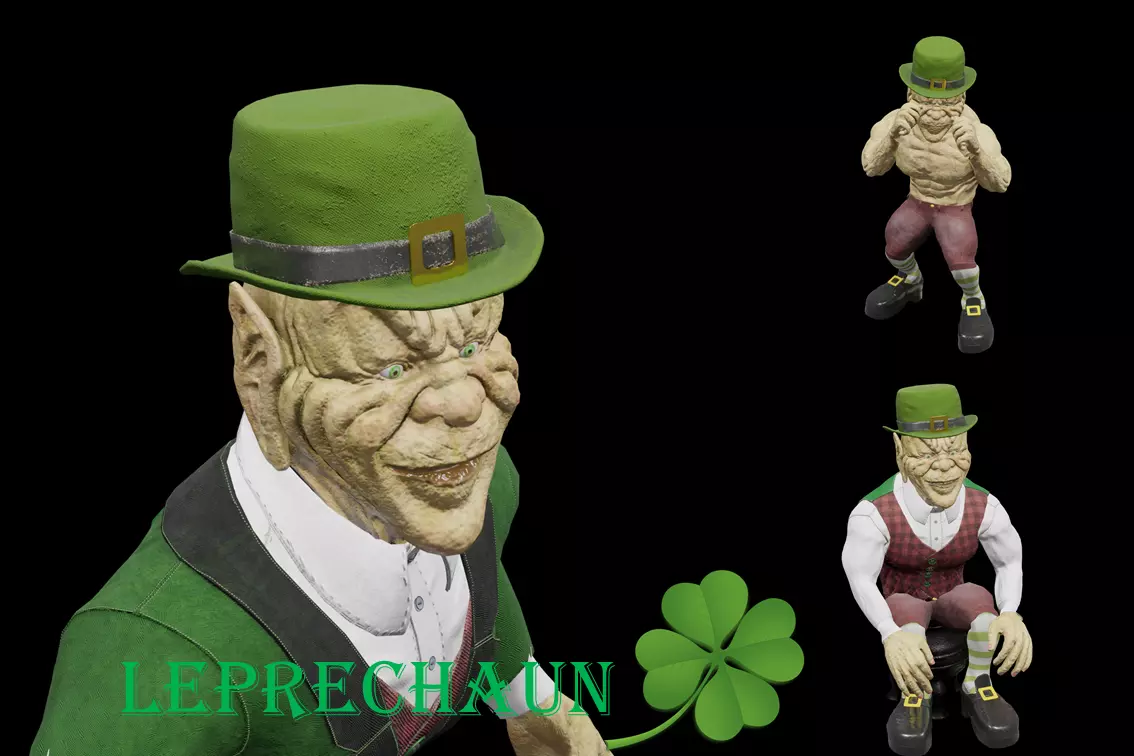 I would like to share with you my character that is fully animated and textured. It is the Leprechaun with facial characteristics and the outfit is inspired by the 90s horror movie. The model is rigged and animated with 28 different animations that can be seen in youtube preview video. The animations include movement (walking, running, jumping and even backlif), attacks (magick attacks, punching, reaction to punches, block) and other (idle standing, sitting, picking objects). The model with animations is exported to fbx file.All the textures are included in the blend file but also, the complete set of images is exported in the archive file. The textures include: BaseColor, Roughness, Normal, Height, AO and Metallic maps for metallic objects (buckle, coin, cauldron, buttons).