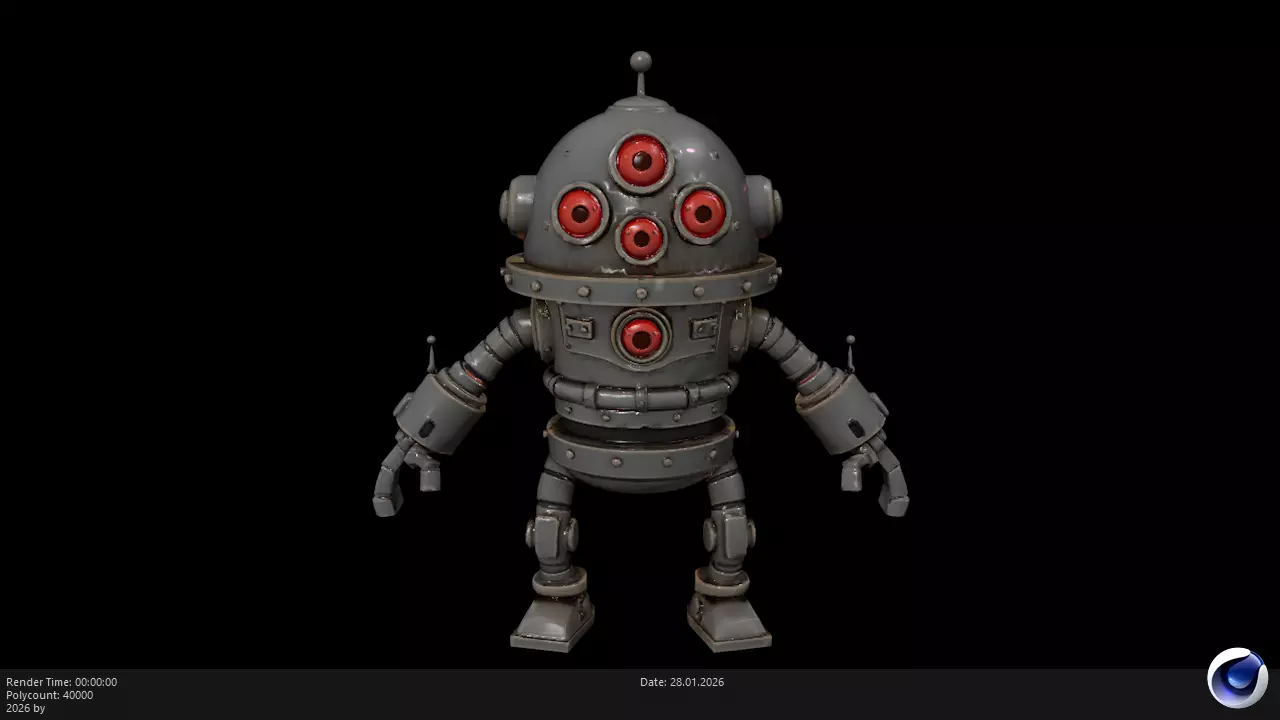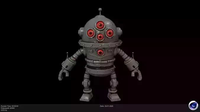 High-Quality Stylized PBR Mechanical Character This is a professional, stylized 3D model of a Multi-Eyed Robot, perfect for use as a steampunk guardian, a futuristic worker drone, or a retro-sci-fi enemy NPC. The model features a unique four-eyed head design with glowing red optical sensors, a robust cylindrical torso, and articulating mechanical limbs. It is built with a full PBR (Physically Based Rendering) workflow, ensuring that the weathered metal surfaces and painted armor react realistically to dynamic lighting while the eyes provide a menacing emissive glow.