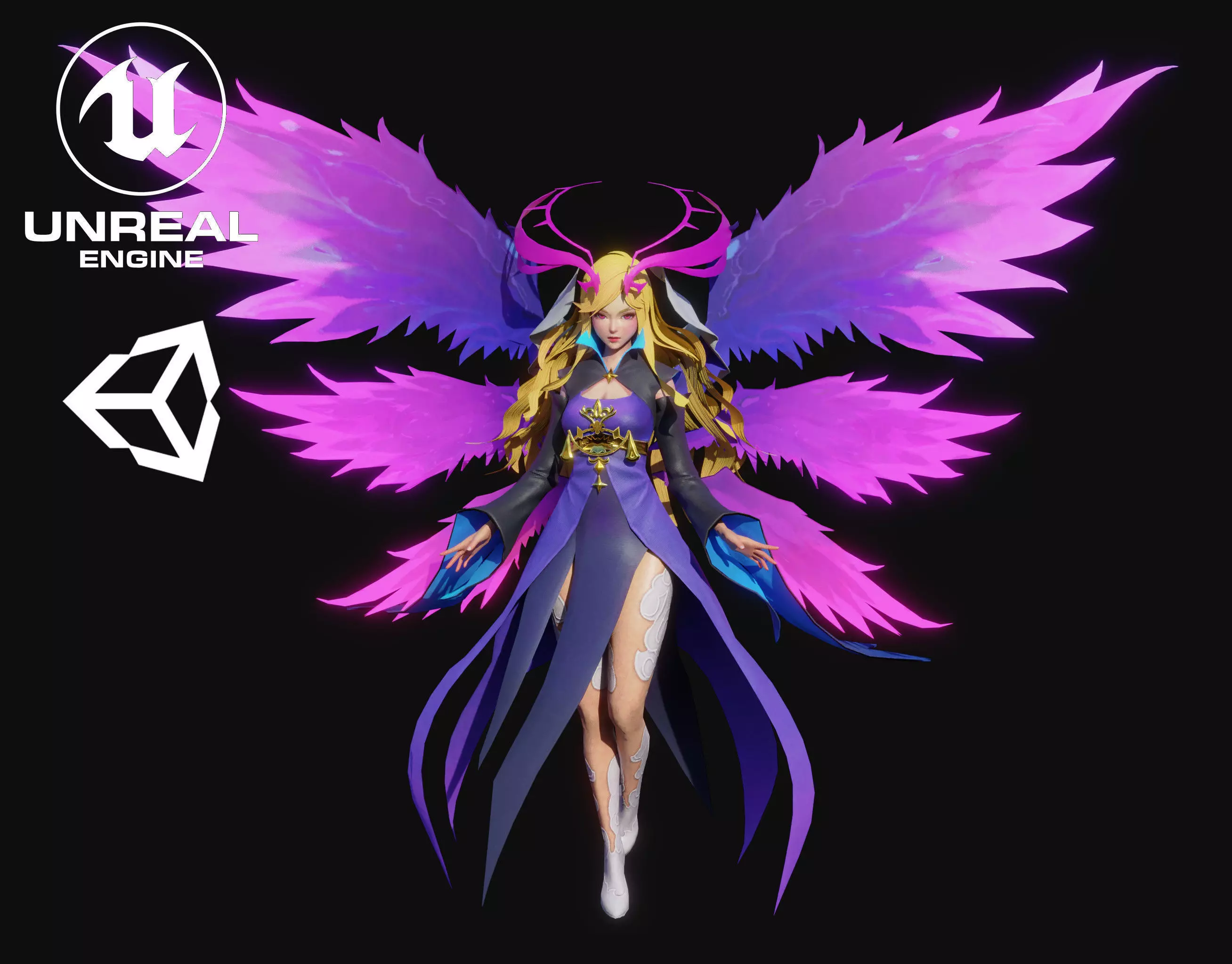 Beautiful low-poly character in 3d model rigged ready for applications in real-time.Sculpting models ZBrush and rigging in Maya.