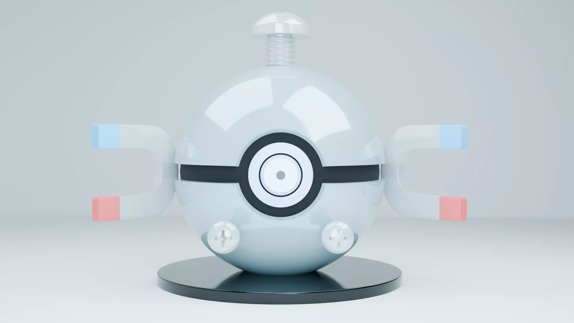 A high-quality, stylized 3D model of the Electric/Steel-type Pokémon, Magnemite. This render features a clean, highly polished look, giving the model a vinyl toy or collectible statue appearance.