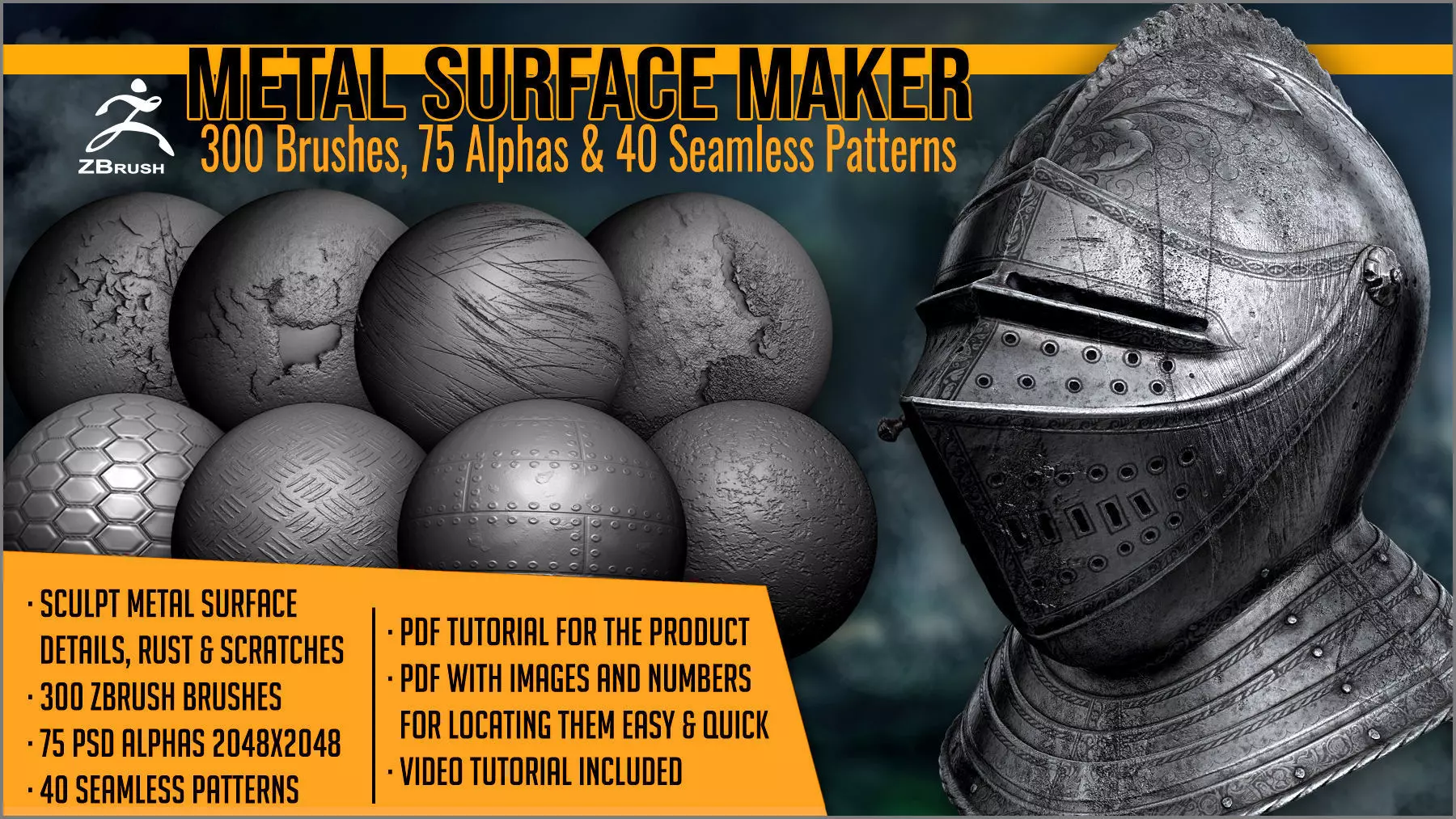 300 ZBrush brushes (75 DragRect, 75 DragDot, 75 Draw, and 75 Spray) for sculpting metal surface details.75 PSD Alphas that you can use in ZBrush and other 3D apps that use alphas. 2048x2048 pixels, 16 bits, grayscale, in PSD and JPG, for all 3D applications.40 Seamless Patterns that you can use in any app for making regular surfaces.ZBrush Surface Noise file included for loading the patterns with base settings.A PDF tutorial, that tells you how to use the brushes and patterns.PDF index of the brushes and patterns to choose them easier.A video tutorial, that you can also find on YouTube (in our channel), but is included in our product for your future reference.The ZBrush brushes include different kind of brushes: