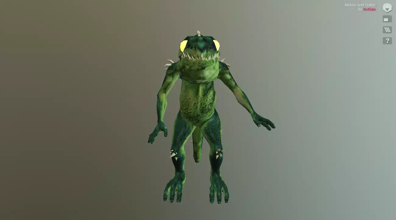 This Mirken, aquatic swamp-like race is fully rigged and animated, ready for plug-in-play. This specific Murken is an acid spitter who uses its giant gulp to activate a hidden reflex that spits out its stomich acid. This race of Mirken likes to live around toxic, posionous areas.