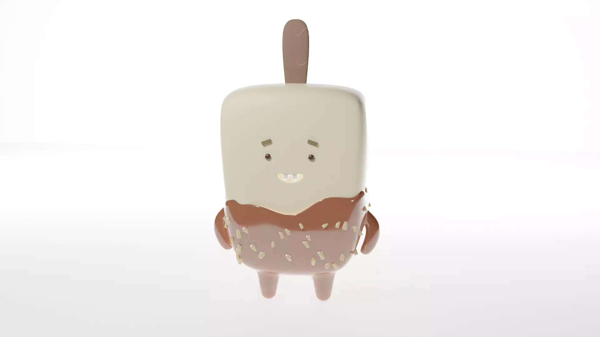 The Ice-Cream model resembles an upside-down ice cream on a stick, complete with arms, legs, and a mouth. It features two square teeth at the top of its mouth, small chocolate-colored eyes, and a white ice cream base with a slight yellowish tint, resembling creamy gelato. The bottom part of the ice cream appears as if it has been dipped in chocolate, with chocolate forming the arms and legs. Additionally, there are sprinkles in the form of small cylinders scattered across the chocolate coating, but not too frequently.
