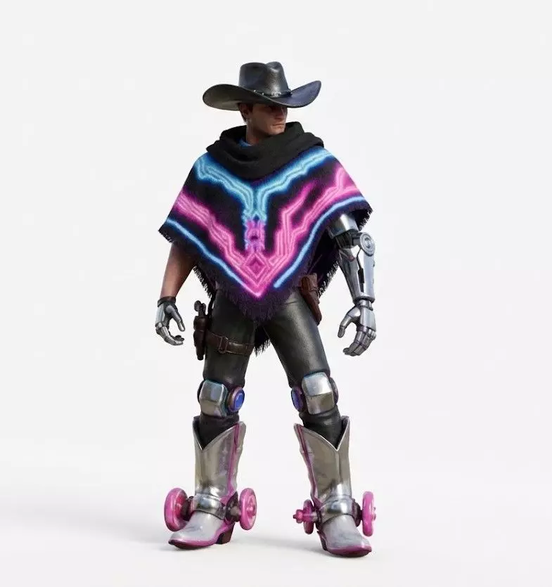 Hover-Skate Boots Instead of traditional spurs, the chrome cowboy boots are equipped with glowing pink energetic wheels or thrusters at the ankles. This unique design element implies the character can skate or hover across the desert sands at high speeds.