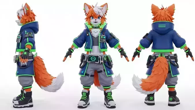 Neon Fox Techrunner is a fully modeled stylized anthropomorphic fox character, perfect for anyone needing a bold furry / mascot style hero for games, animation, VTubers, or illustration renders. The design is original and not based on any existing franchise or character.