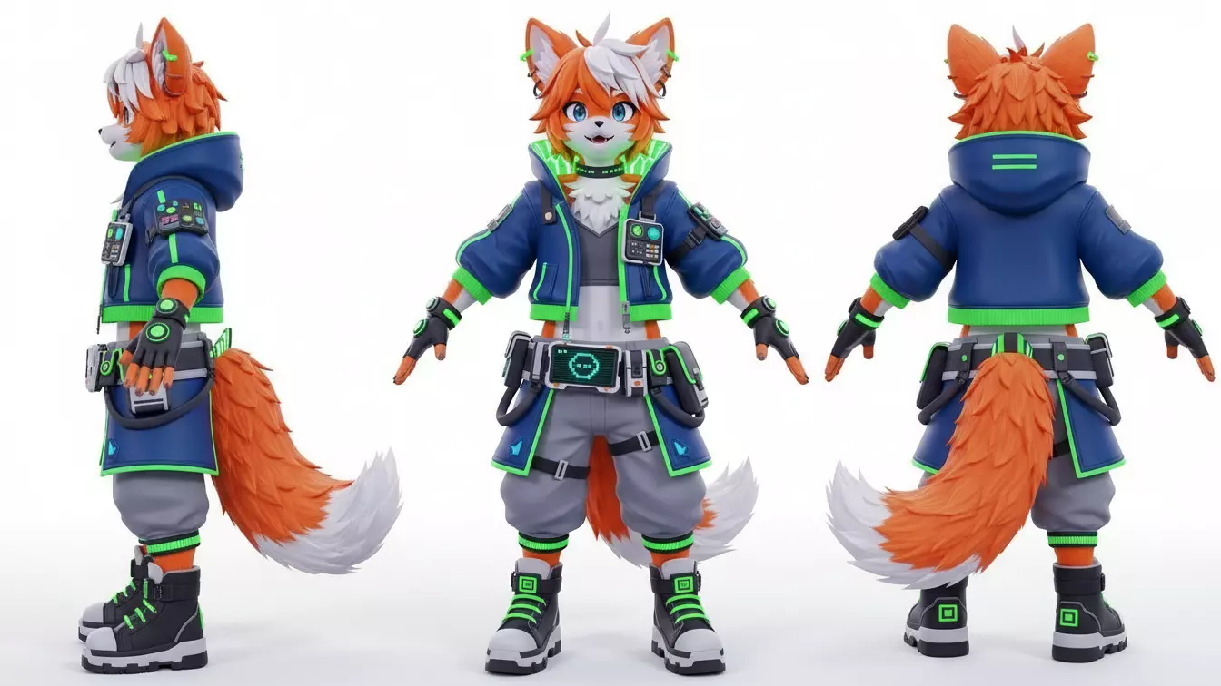 The character wears futuristic street-tech clothing with bright accents: oversized hoodie, layered utility belts, gloves, cargo shorts, high-top shoes, and a fluffy two-tone tail. Front, side, and back details are all carefully sculpted so the model reads clearly from every angle.