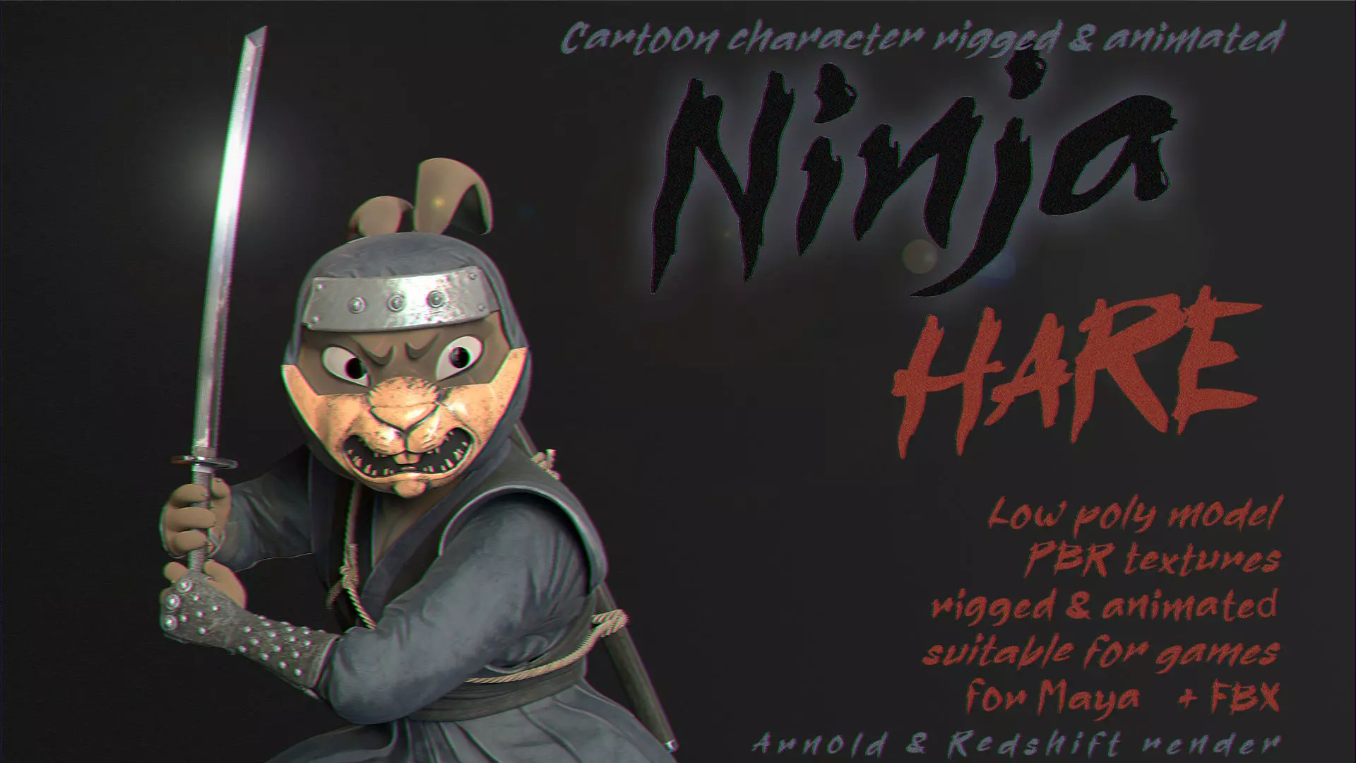 The face is covered with a scary mask that can be hidden and reveal the face. The face is also animated if desired.There is a controller for switching the sword from the left hand to the right and unparenting it into world space.Otherwise, the full body rig is equipped with standard features that are familiar to all animators.The scene with the character is already configured for rendering lighting using two popular renderings in Maya - this is Redshift and Arnold render. The character shaders are already configured to render two different shaders on different renders, which does not require any reconfiguration when changing renders.