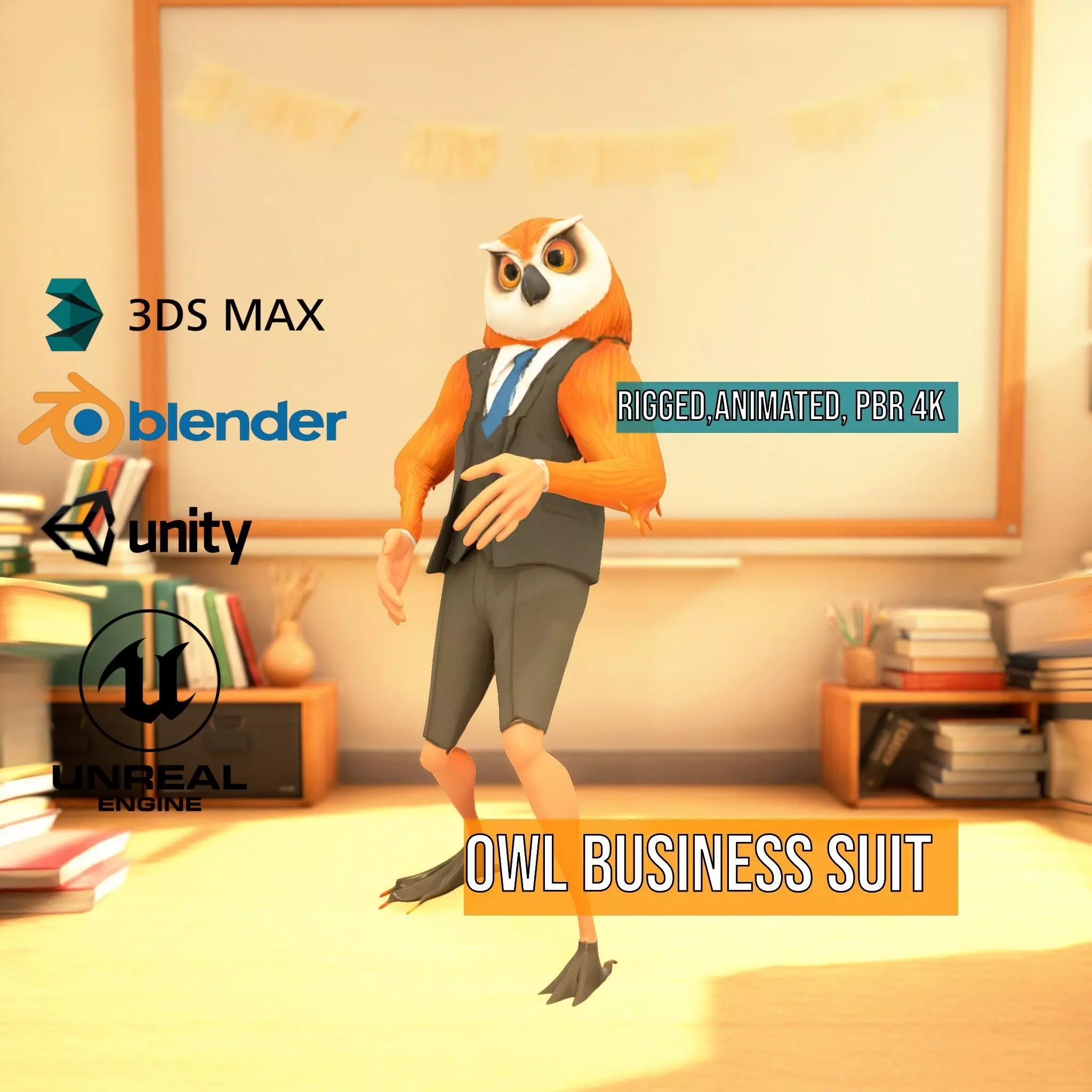 This 3D model features a whimsical anthropomorphic owl character dressed in a stylish business suit, perfect for animation, gaming, and advertising projects. Each model has 3 levels of detail: low-poly (1000 triangles for mobile), middle-poly (10,000 triangles for environment), and high-poly (100,000 triangles), allowing for use in production rendering (such as 3ds Max, Maya, Cinema 4D, Blender, Vray/Corona/Cycles), game engines (Unity and Unreal compatible), and interactive presentations, based on the LOD System principle. This model is ideal for humorous commercials, creative presentations, and animated series. The model's textures are PBR, Diffuse, NormalMap, and reflection/roughness/metallic, suitable for modern rendering engines. Models are accurately unwrapped with no overlapping UV. All textures are 4096x4096 in size. If you like this model, please like and leave a comment!