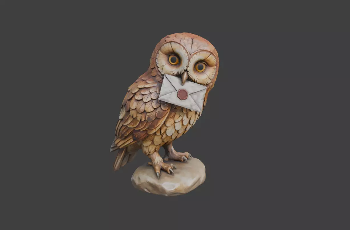 The art style strikes a balance between realism and stylization. Feather details are pronounced but not overcomplicated, making the model efficient while still visually rich. The expressive eyes provide emotional impact, and the envelope’s wax seal introduces a subtle pop of contrasting color that enhances visual interest.