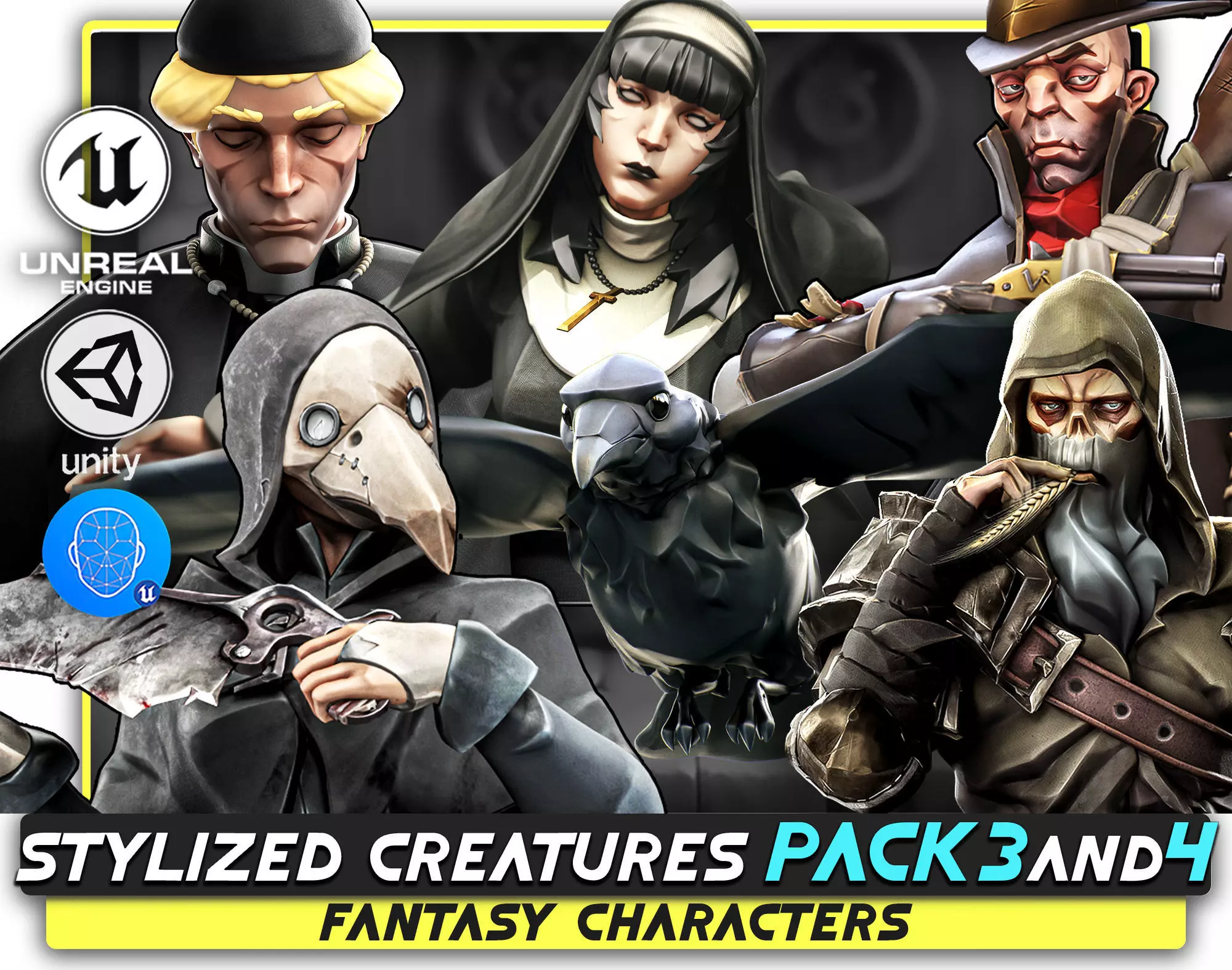 The next chapter in the Fantasy Characters line unveils a refined stylized fantasy roster - he-roes, zealots, and horrors bound by religion, madness, and plague. This collection blends di-vine faith and corruption: a cleric priest, a fearless nun, a haunted girl nurse, a relentless mon-sterhunter, a resurrected draugr, and a spectral raven crow companion. Each creature is sculpted for rpg, dungeon, or halloween settings - medieval, gothic, and strikingly spooky.