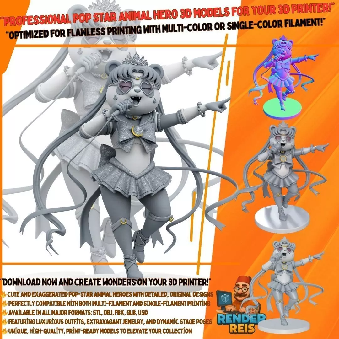 This enchanting 3D print model blends the universally loved panda character with the elegant and powerful style of the iconic anime heroine Sailor Moon. Designed like a pop idol on stage, this figure radiates both cuteness and charisma.