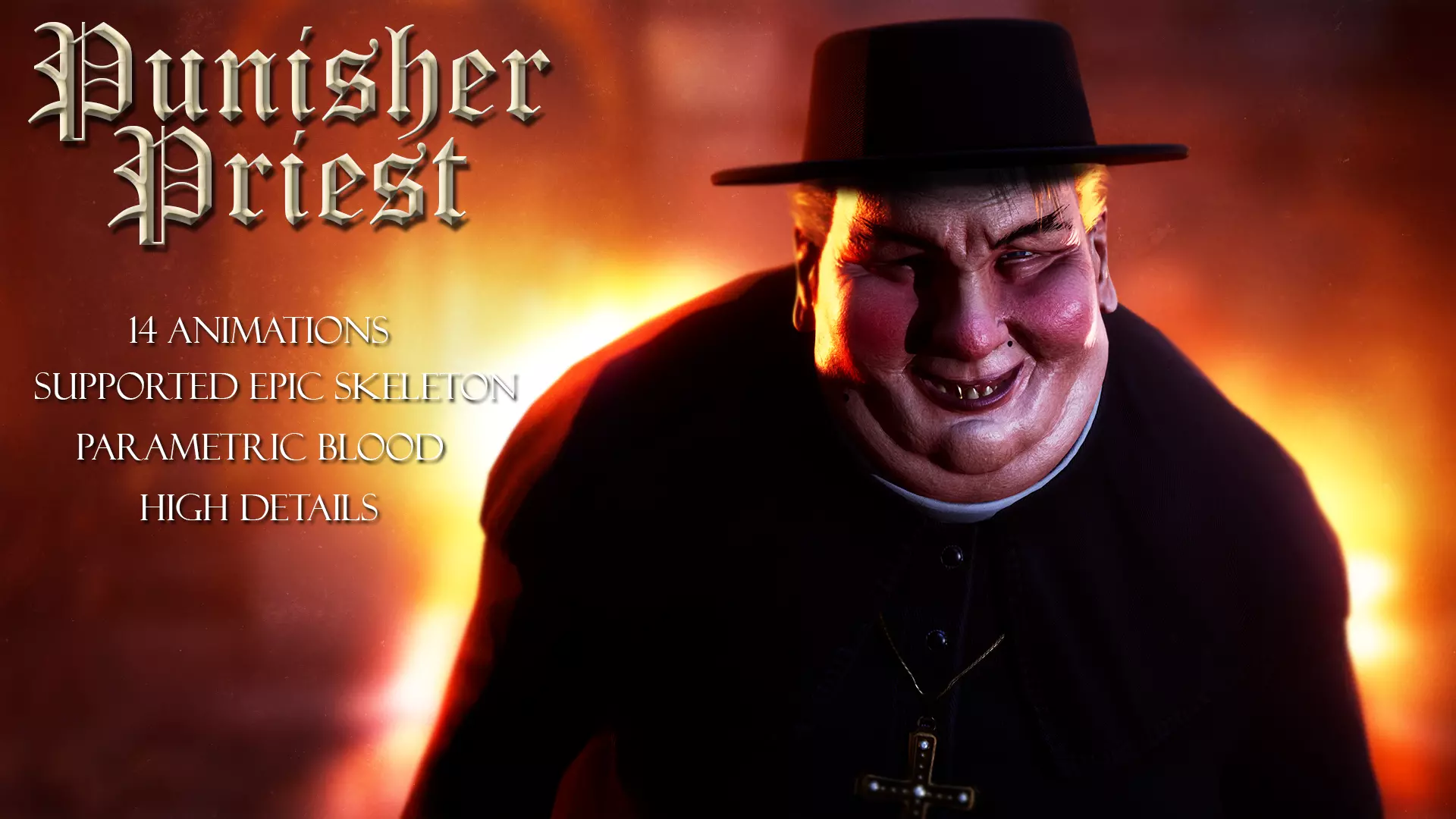 Punisher Priest is a high-quality, game-ready character ideal for horror, dark fantasy, or post-apocalyptic projects. Fully rigged to the Epic Skeleton and Unity Humanoid system, it comes with 14 detailed animations including attacks, hit reactions, and death sequences. The model features modular components with extra bones (strip, cross, weapon) and a weapon socket for seamless integration. Materials are set up for Unreal Engine with customizable procedural blood textures and parametric controls. Includes 4 master materials and 6 material instances at 2K and 4K resolutions. The character model has 51,403 triangles and 39,968 vertices, with LODs and collisions enabled. The included axe features 12,482 triangles, 4K textures, and full collision support. Compatible with both Unreal Engine and Unity, this asset is fully optimized for real-time applications and cinematic sequences.