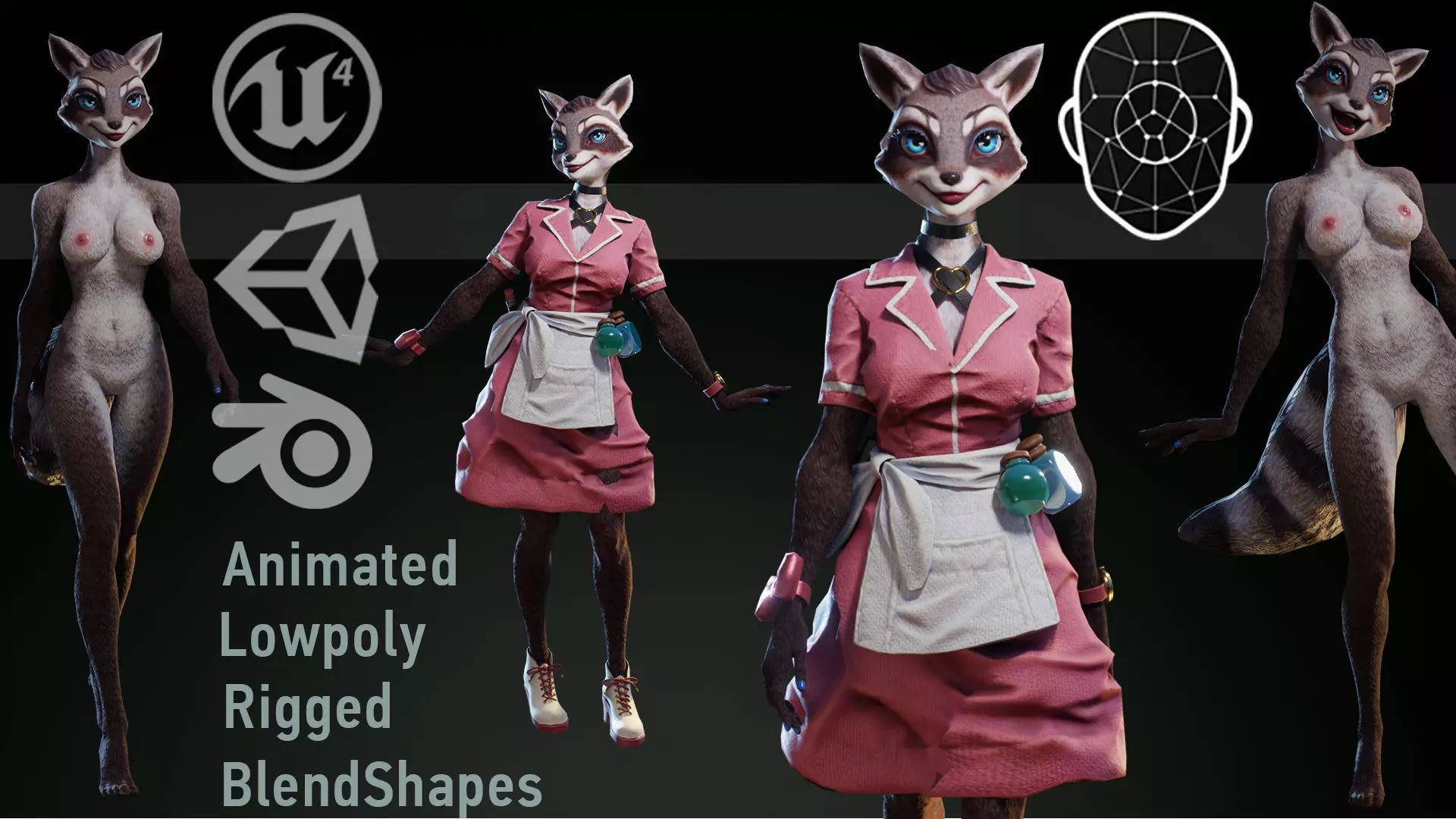 Raccoon Girl Waitress Low-poly 3D model