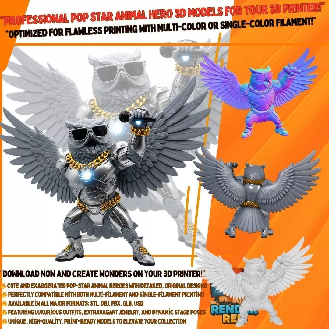 This futuristic 3D print model portrays an armored owl as a dominating stage performer. Fusing robotic precision with the raw spirit of metal music, this winged figure sings into a mic while radiating energy from its mechanical fist.