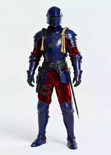 Technical NotesFiles Included: FBX (Rigged), GLB, OBJ, ZIP (Textures).Quick Tip: To accurately render the Velvet, use a specialized Fuzz or Sheen map in your shader. This simulates the way micro-fibers catch the light at glancing angles, which is essential for making the red fabric look soft rather than like flat plastic. For the Blue Armor, keep the Roughness map relatively low to maintain that high-end lacquered appearance.