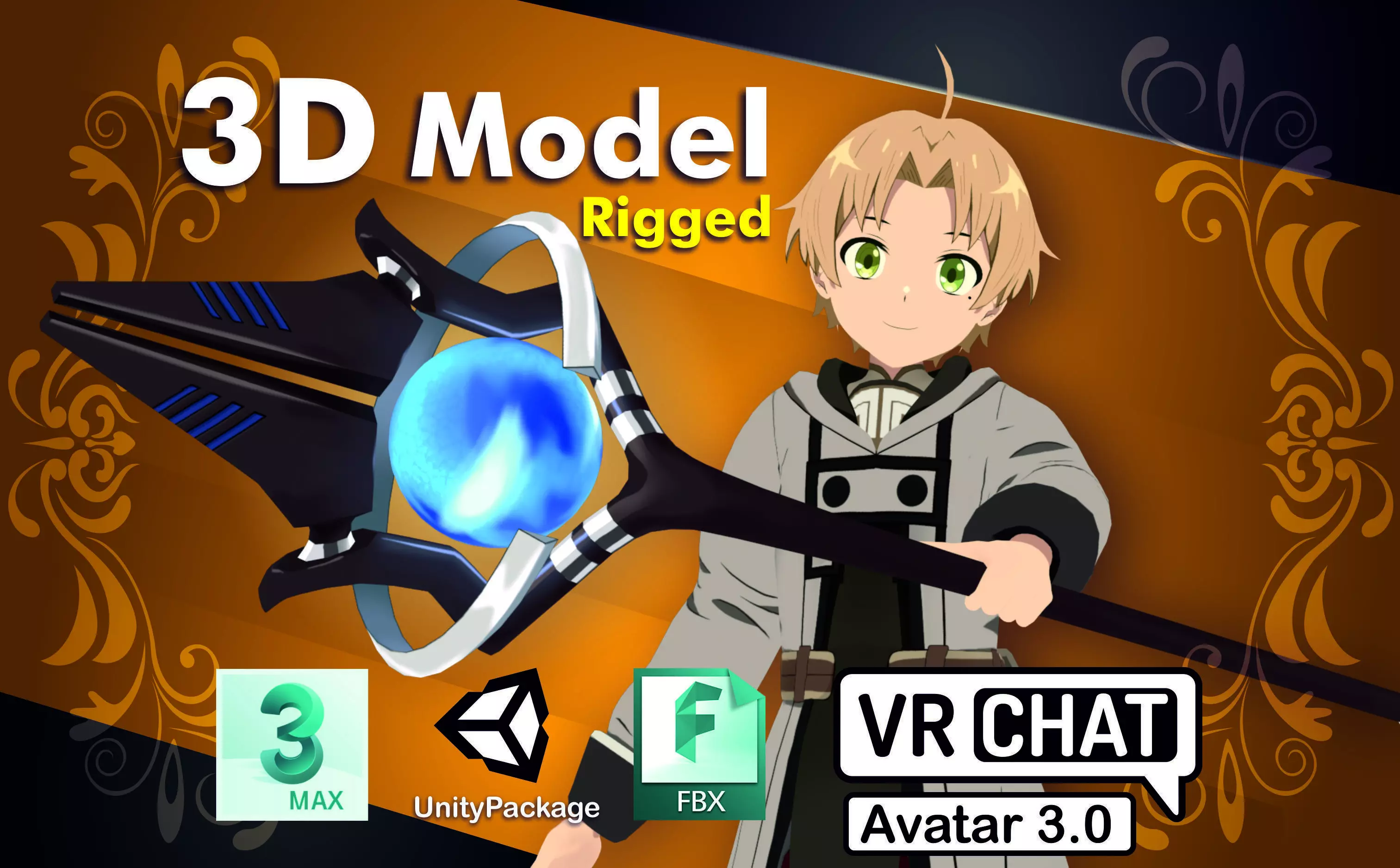 Rudeus from Mushoku Tensei for VRChat PC. Just import the unitypackage file into unity, open SceneAvatar and publish as any other avatar!
