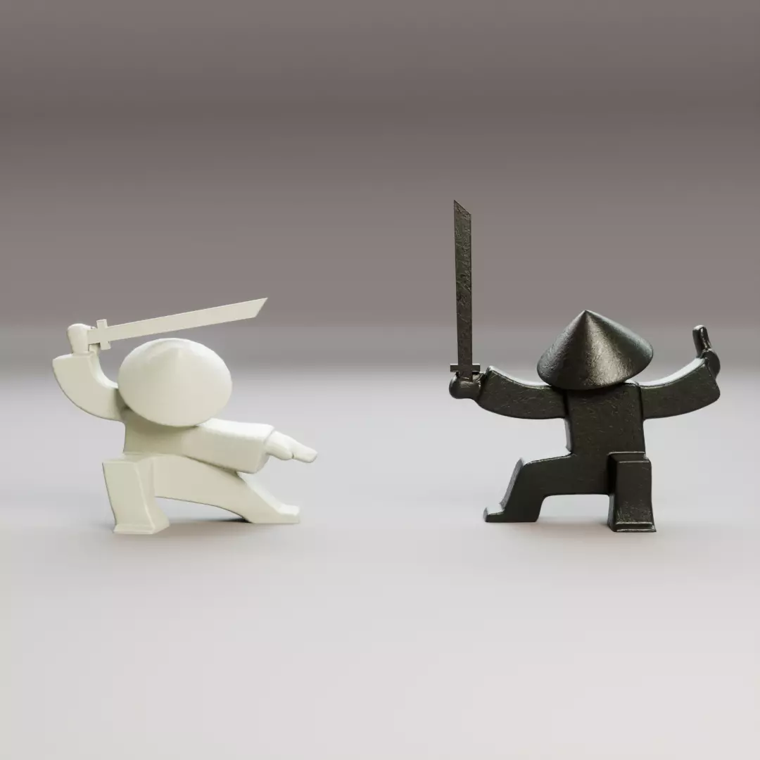 Stylized 3D models of two samurai figurines in dynamic combat poses.These minimalist characters are designed as decorative collectible models suitable for interior renderings, product visualizations, stylized cinematic shots, or game environments.