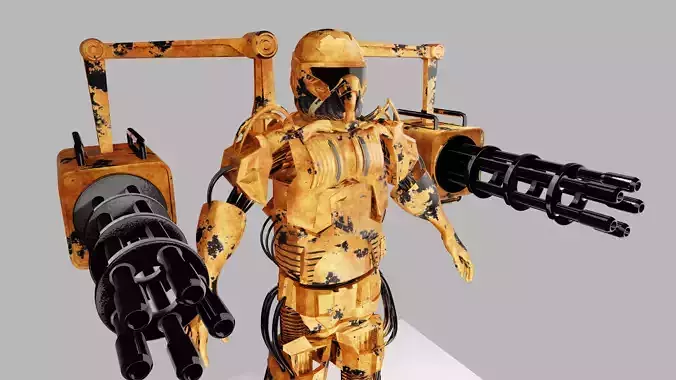 A high-poly sci-fi robot soldier designed for cinematic scenes, futuristic battles, and high-end game environments. This character features a rugged exoskeleton with dual heavy rotary cannons mounted via mechanical arms, delivering a powerful and intimidating look.The model comes fully UV unwrapped (non-overlapping) with a single 4K PBR texture set including normal maps for detailed surface definition. Ideal for showcasing in next-gen sci-fi games, trailers, or concept art.