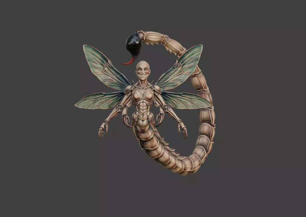 • Unique hybrid creature design (dragonfly + scorpion + humanoid)• Strong silhouette and visual readability• High-detail sculpted anatomy• Stylized yet realistic PBR materials• Game-ready and optimized• Perfect for fantasy and horror projects