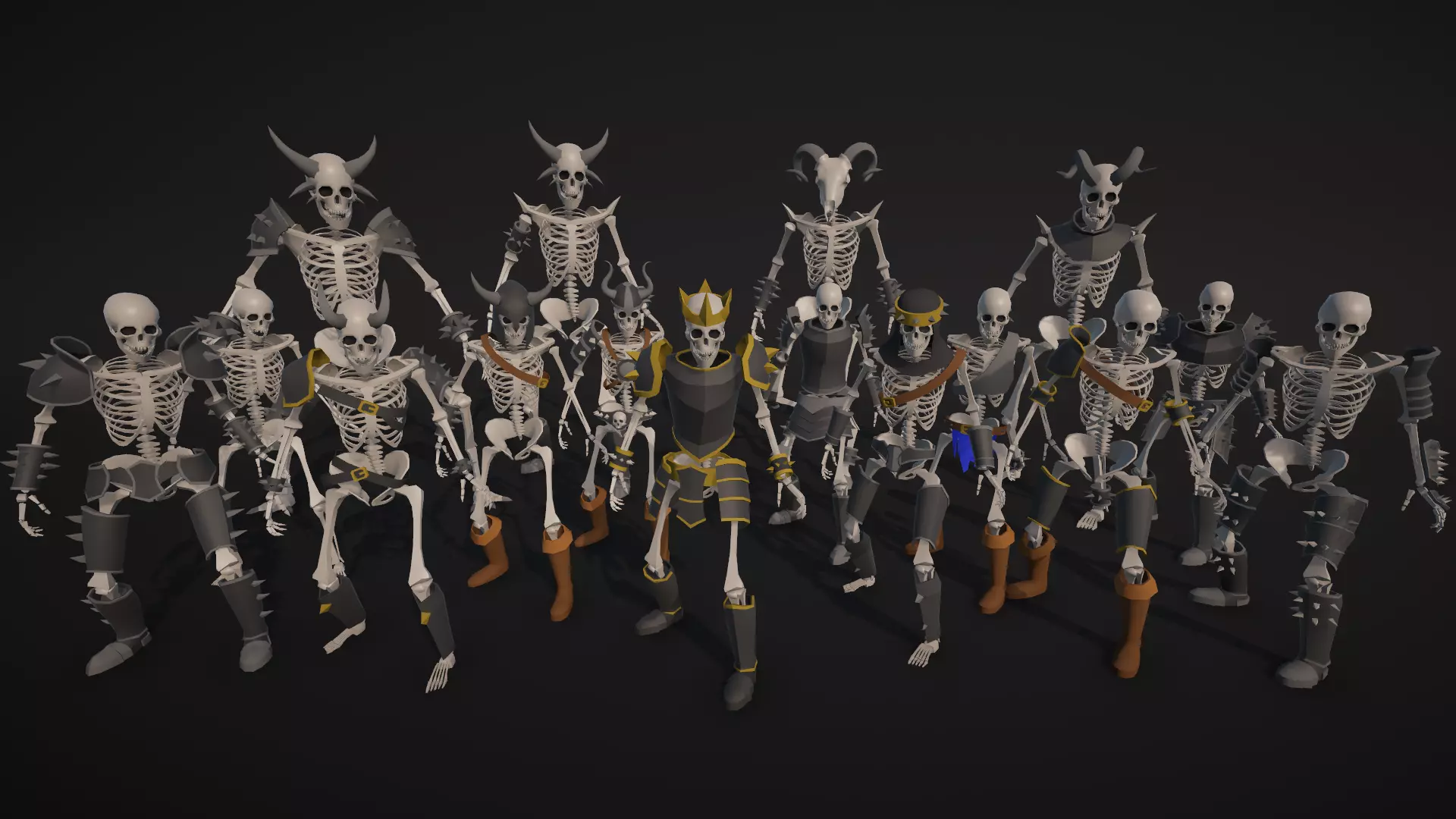 1 Showcase scene36 Unique models and prefabs16 LowPoly Skeletons Knights Characters20 LowPoly Melee Weapons