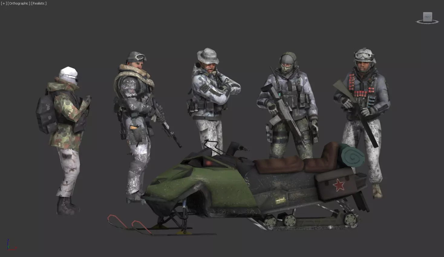 A small squad of infantry support characters with a weathered snow-mobile/jet-sled in the center.Appearance: five soldiers in winter camo with varied gear (backpacks, plates, and scarves). Each soldier has a distinct posture, ready for action, with a rugged, survivalist vibe.Vehicle & gear: a compact, rugged snow-sled or scout bike in muted olive/green tones, with a brown leather seat and storage pouches. Accessories include a red star emblem on one bag, implying a thematic faction.Materials & textures: worn fabrics, snow-dusted armor, and metal hardware; overall palette is gray, white, and earth tones to convey arctic/foothill conditions.Character vibe: a troops unit prepared for cold-weather operations, capable of mobility with a light armored transport.
