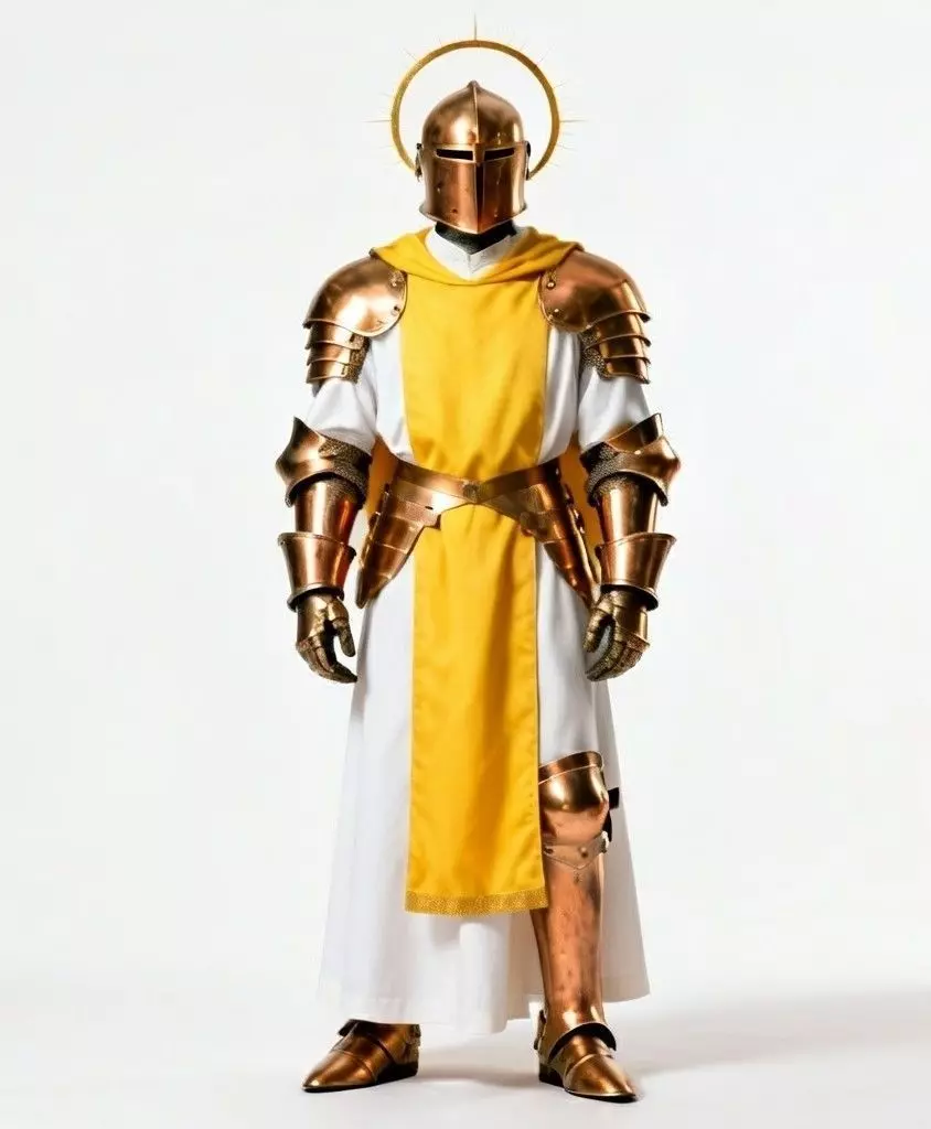Layered Holy Robes Underneath the armor, the character wears a long white dress (tunic). A bright yellow cloth (tabard) hangs down the front, representing the sun and adding a splash of bright color to the design.
