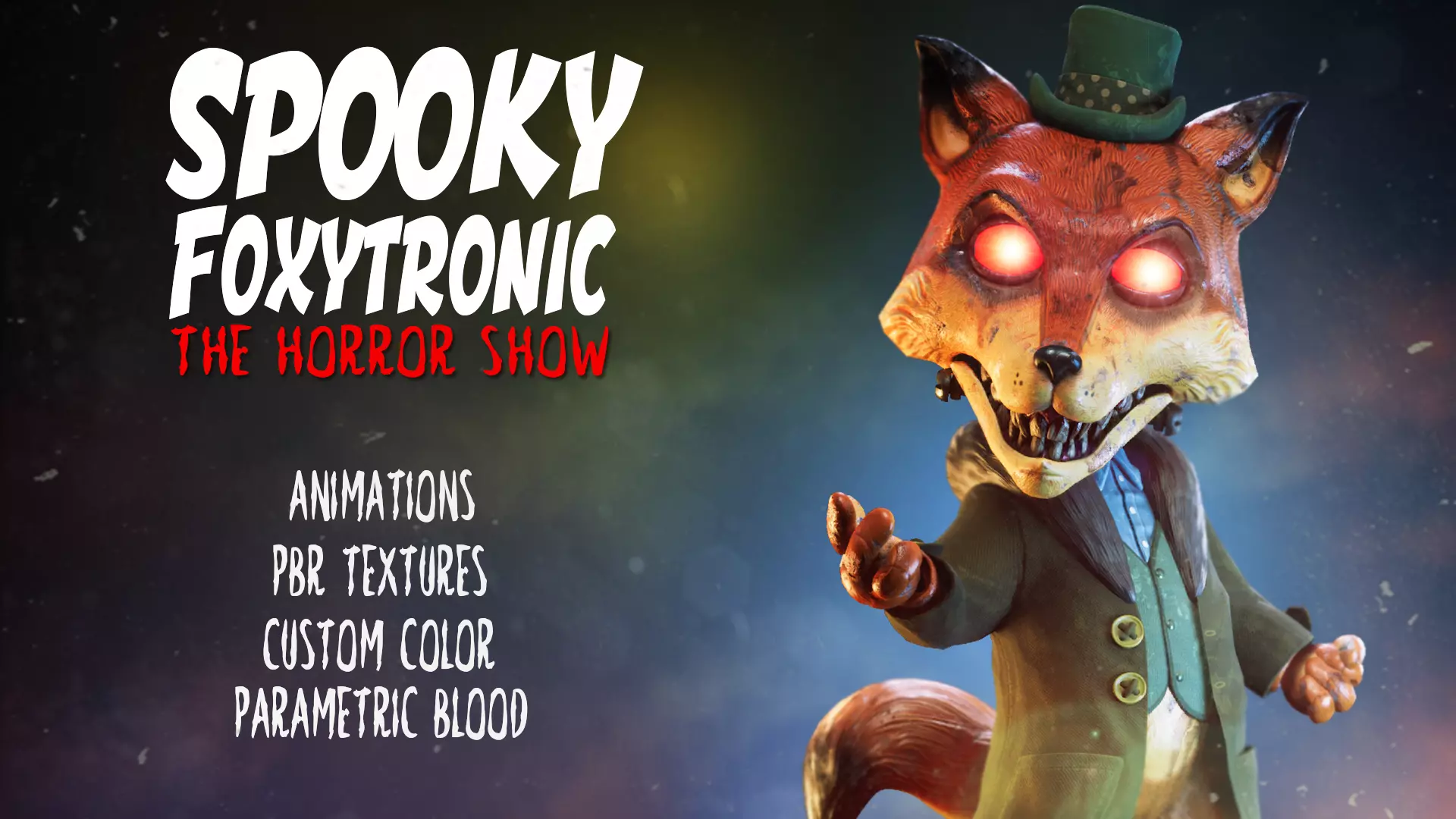 Spooky Foxytronic is a horror-themed, game-ready 3D character optimized for Unreal Engine and Unity. Fully rigged and animated, it includes 19 high-quality animations (idle, walk, run, attack, scream, death, and more) and is easily retargetable to the Humanoid Epic Skeleton.