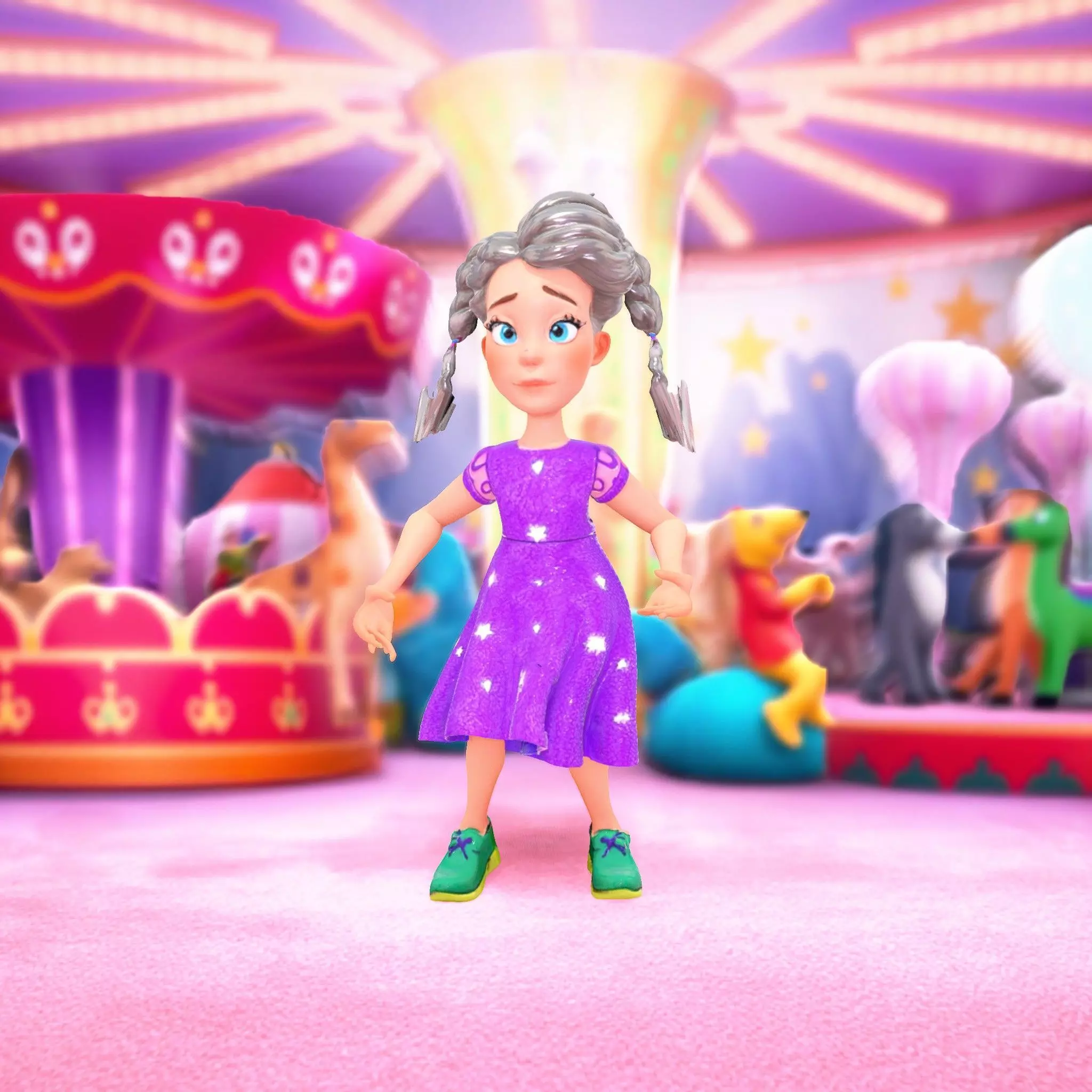 This delightful 3D model features a charming character with braided hair and a whimsical purple dress adorned with stars. Each model has 3 levels of detail: low-poly(1000 triangles for mobile), middle-poly(10 000 triangles for environment), and high-poly(100 000 triangles), which allows for the use of this model in production rendering(such as 3ds Max, Maya, Cinema4D, Blender, Vray/Corona/Cycles and all others), game engines(Unity and Unreal compatible), and interactive presentations, providing a choice of detail based on the LOD System principle. Perfect for animated films, children's games, or interactive stories. The model's textures are PBR, Diffuse, NormalMap, and reflection/roughness/metallic, which are suitable for any modern rendering engine. All models accurately unwrapped and have no overlapping UV. All textures are 4096*4096 in size. Like and comment if you enjoyed this model!