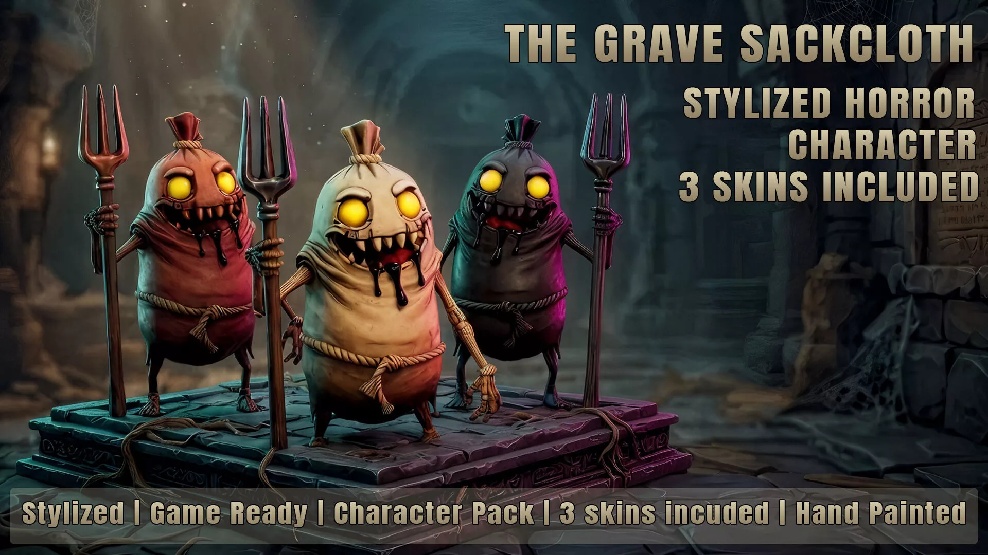Stylized horror creature “Grave Sackcloth” – a unique game-ready 3D character with 3 skin variations.