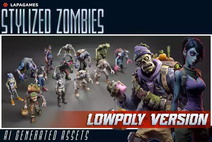 Multiple stylized lowpoly zombie charactersClear silhouettes & readable shapes for gameplayAI-assisted hand-polished workflowLightweight geometry, performance-friendlyHigh-quality stylized textures includedBlender (.blend) formatPerfect for survival, shooters, RPGs, tower defense & mobile gamesWorks great in Unity, Unreal, Godot, Blender