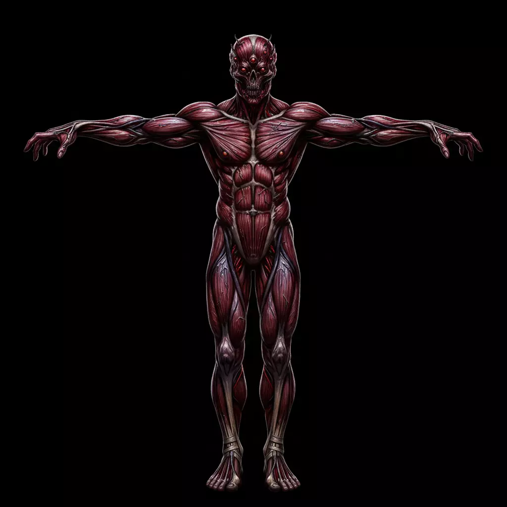 A disturbing flesh monster horror creature designed for extreme horror games, dark fantasy worlds, and cinematic productions.This grotesque humanoid entity is composed entirely of twisted muscles and exposed flesh, with no visible skin layer, revealing veins and tendons throughout the body. The partially melted face with multiple eyes creates an intense and unsettling organic horror presence.
