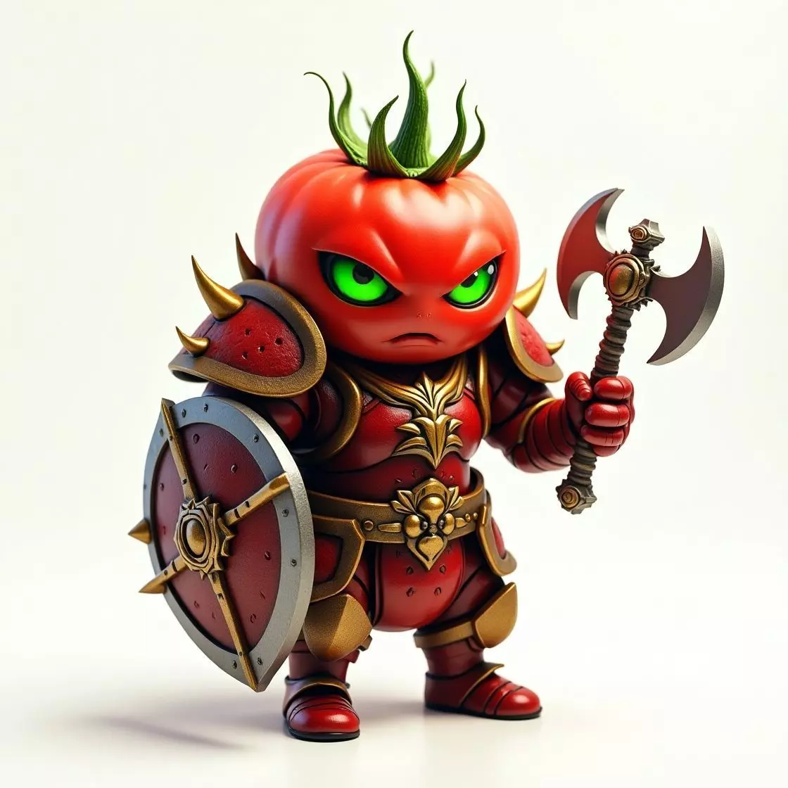 TomatoKnightWarriorFantasyCuteArmorVegetableFoodCharacterShieldAxeQuirkyRPGGamingModelWhimsicalCreativeUniqueMedievalFighter