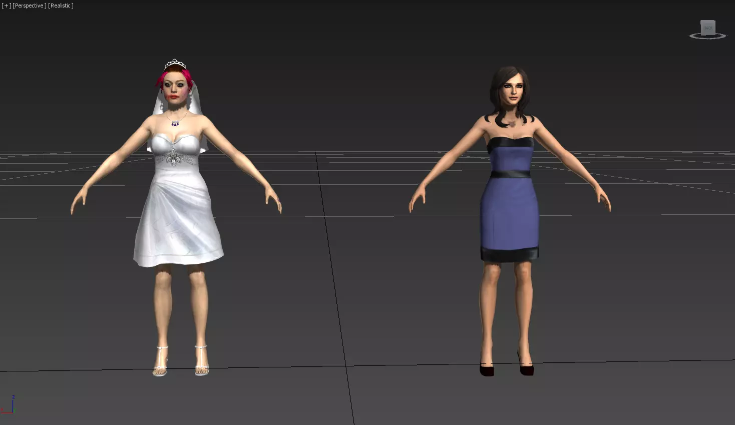 A pair of contrasting female characters standing in a neutral T-pose.Left: a bridal look with a white satin dress, veil, tiara, and subtle jewelry. She wears strappy sandals and has a gentle, composed expression, suggesting a classic wedding aesthetic.Right: a chic evening look in a strapless blue-and-black cocktail dress with a black waist sash. She has styled hair, minimal jewelry, and matching heels, conveying modern, sophisticated glamour.Both figures have natural skin tones, slender builds, and elongated limbs typical of stylized 3D models. The scene uses a dark gradient background with a simple floor grid to emphasize the characters.Tags3D modelwedding dressbridalcocktail dressfashiontwo charactersheroinefemaleT-posestylized realism