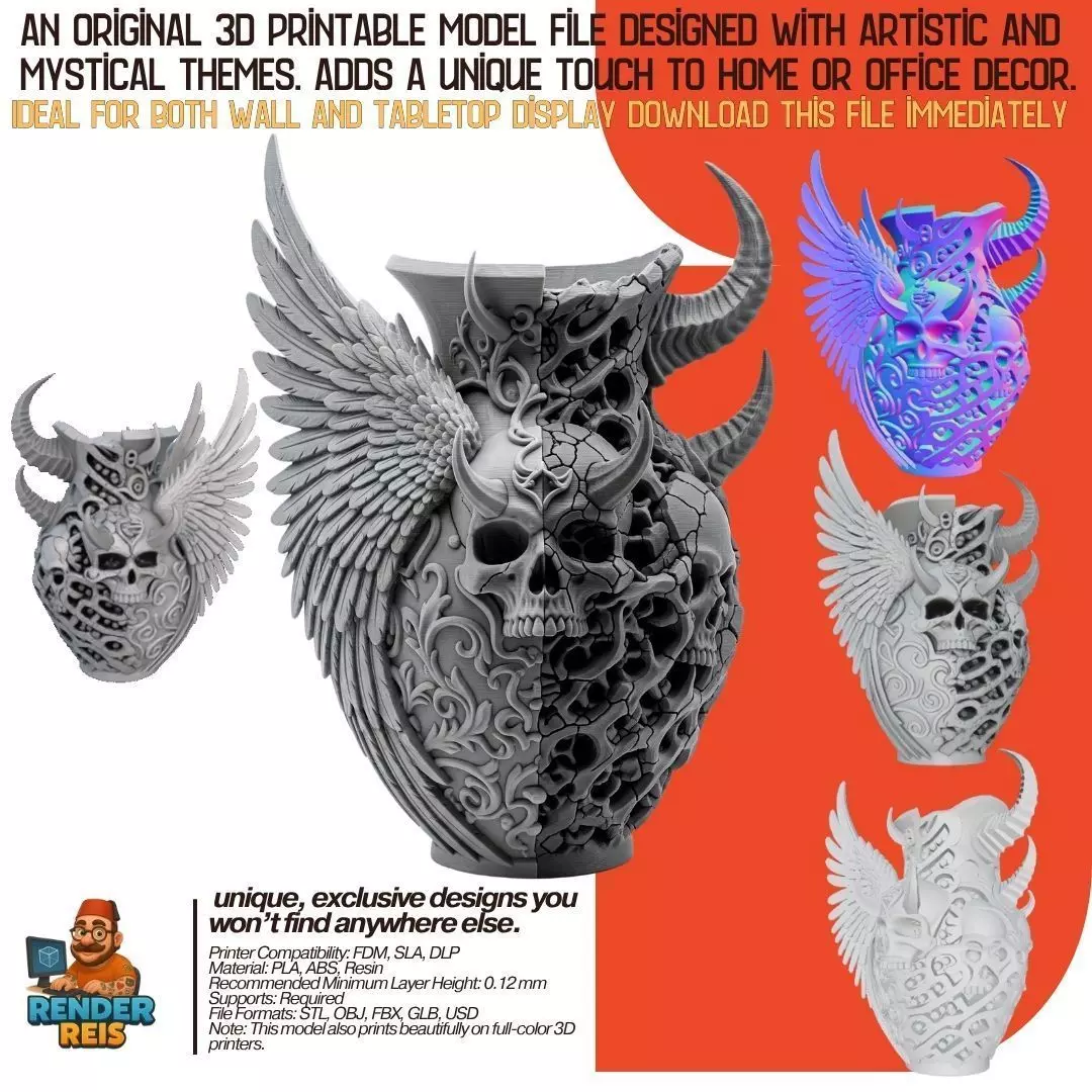 This mesmerizing decorative vase symbolizes the eternal cycle between life and death by merging angelic grace with demonic darkness. One side features a serene skull adorned with feathered wings and classic engravings, while the other side displays horns, cracked textures, and skeletal elements for a haunting allure. Printed in gray tones with prominent 3D layer lines, this piece blends mystical symbolism with modern art. A striking artistic centerpiece for any setting, it’s ideal for collectors and lovers of sophisticated themed decor.
