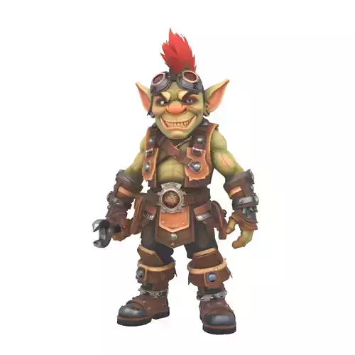This highly detailed 3D model captures a mischievous goblin engineer straight from the chaotic workshops of World of Warcraft, rendered with intricate precision for immersive gameplay or display. Standing short and stout at about three feet tall, his vibrant green skin gleams with a subtle oily sheen, accented by craggy wrinkles, pointy bat-like ears, a bulbous hooked nose, and a toothy grin revealing jagged yellowed teeth. A wild, fiery red mohawk spikes defiantly atop his bald scalp, adding to his explosive personality. He sports a rugged mechanical leather vest bulging with brass gears, tangled belts, and stuffed tool pouches, paired with grimy oil-stained pants tucked into heavy boots reinforced with dented metal plates for enduring workshop mishaps. Perched on his forehead are oversized tinted goggles, ready to flip down for tinkering, while his calloused hands grip a hefty chrome wrench in one and a crumpled blueprint in the other, arms bearing faded scars from past dynamite disasters. Every texture pops vividly—from the worn leather cracks and metallic glints to the subtle skin pores and fabric weaves—ensuring seamless 360-degree rotation with consistent detailing across front, side, back, and top views, isolated against a clean white backdrop for easy integration into any scene.
