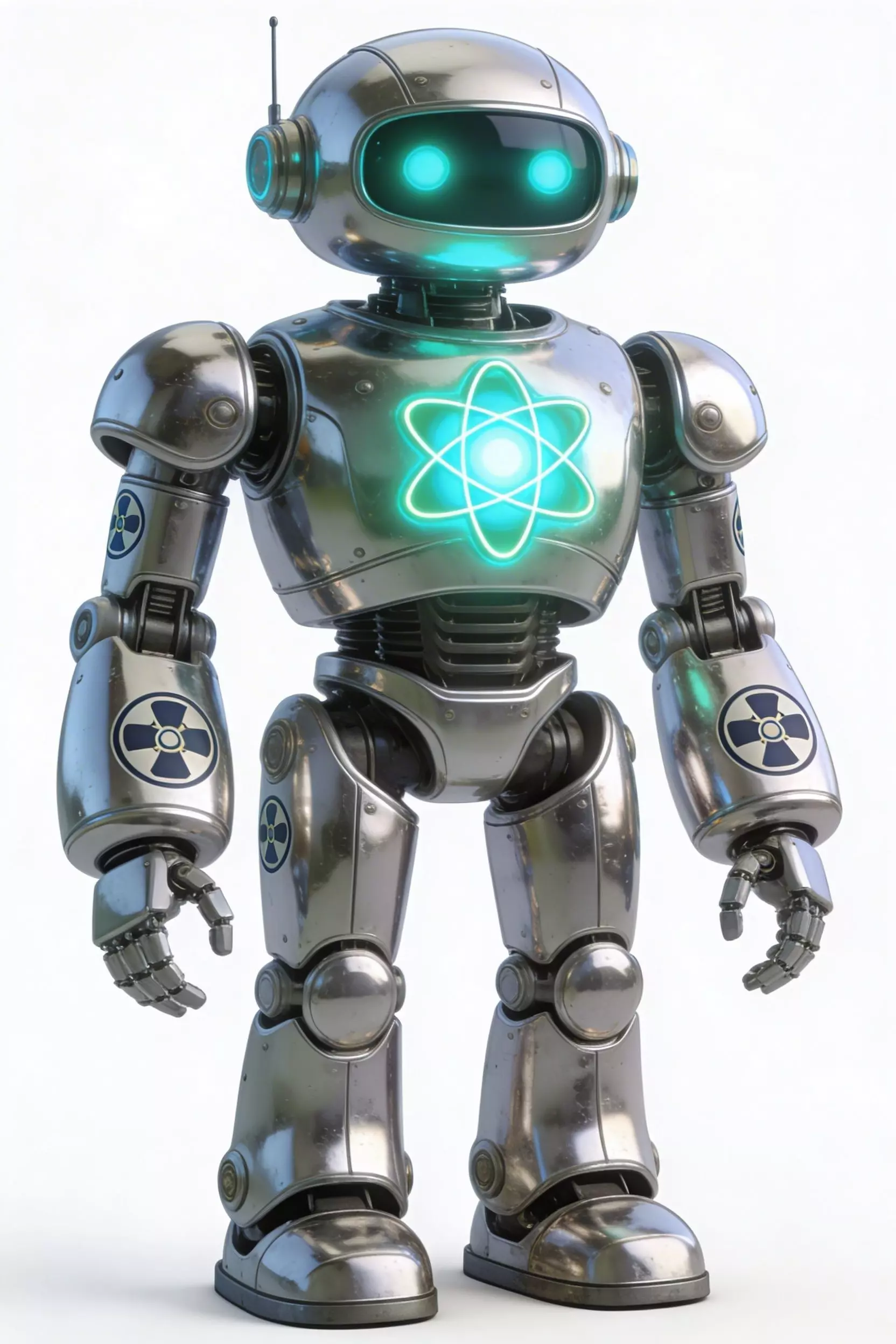 A prominent central glass-enclosed torso houses a vibrant cyan atomic energy core with a glowing orbital symbol, complemented by radioactive warning decals on the forearms and thighs.