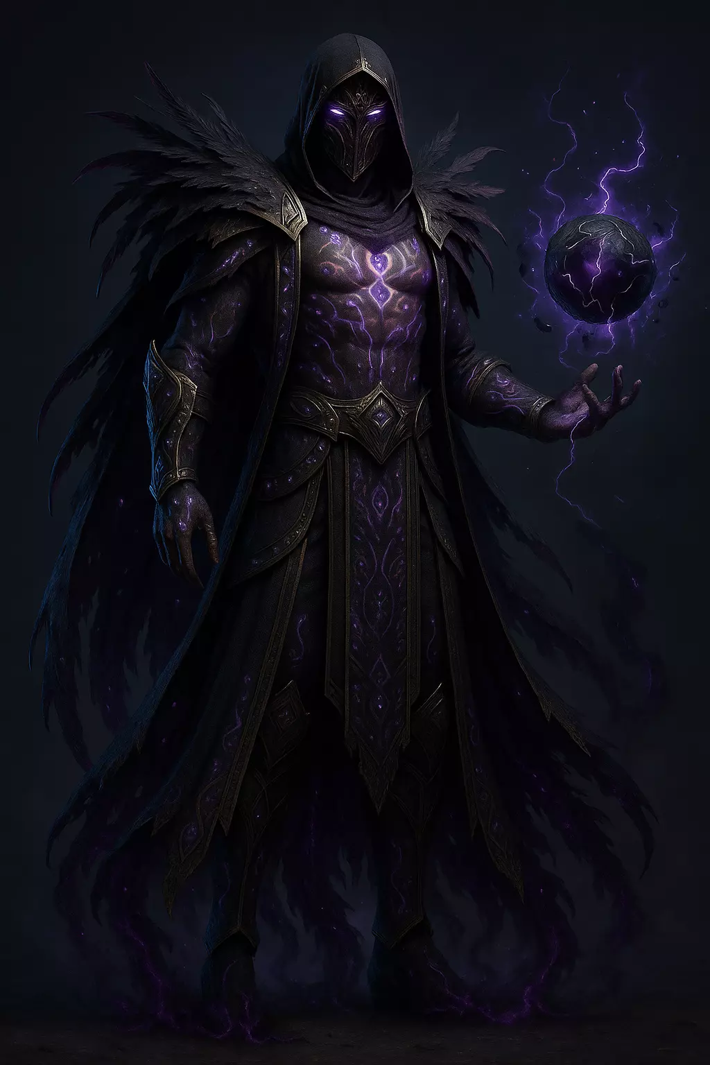 The character wears a flowing, layered robe embedded with intricate runes and glowing purple patterns. His armor features ornamental gold plating, dark gems, and a full-face helmet that radiates secrecy. The feathered shoulders enhance his dark silhouette, while his semi-corrupted skin pulses with raw arcane power. The floating orb emits dark magic, suggesting an uncontainable energy source at his command.