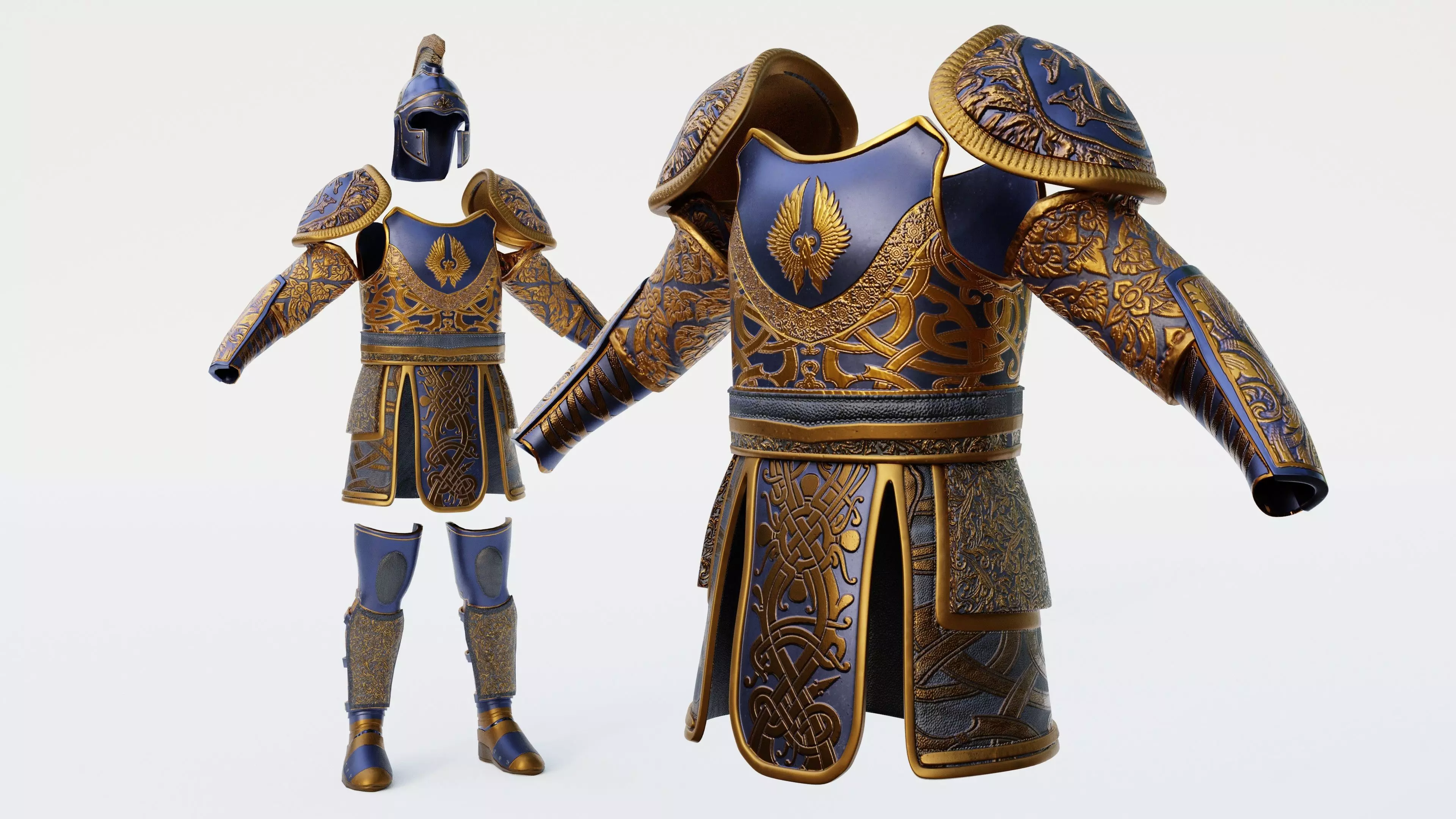 Royal Roman warrior armor with beautiful details of gold on blue metal