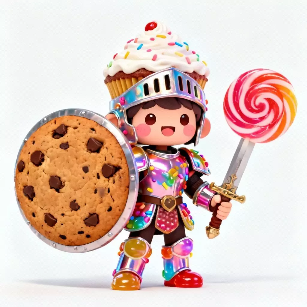 Cupcake Helmet The knight's helmet is designed to look like a delicious cupcake. It features white frosting on top, covered in colorful sprinkles, and is finished with a bright red cherry as the crest.
