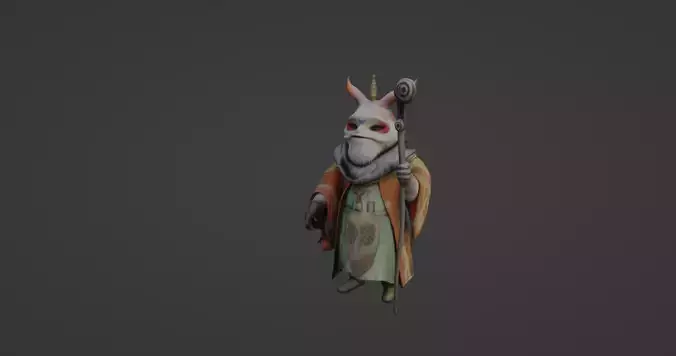This meticulously crafted 3D model depicts a wise elder character, exuding an aura of wisdom and mysticism. The character features a blend of animal-like and humanoid traits, with a white furred face, expressive orange-tinted horns, and a serene, contemplative expression. Draped in intricately designed robes adorned with ornate patterns, the attire reflects a rich cultural heritage. Accessories like the wooden staff and small pouches emphasize the character's role as a guide or shamanic figure in a fantasy setting.The textures are rendered with incredible detail, bringing life to the fabric's embroidery, the weathered wood of the staff, and the fine fur details. Every element has been carefully crafted to provide realism while maintaining a stylized fantasy aesthetic. The color palette blends warm earth tones with hints of turquoise and gold, creating a visually striking composition that will stand out in any scene.This model is fully rigged and ready to be used in a variety of projects, including animation, games, or concept art. It is available in both GMB format and FBX format, making it versatile and compatible with most 3D software. Textures are included, ensuring that the model retains its stunning visual quality upon import.Ideal for use in fantasy storytelling, RPGs, or artistic renders, this character model adds depth and personality to any project. Its unique design and highly detailed features make it an excellent choice for creators seeking a distinctive and compelling character.