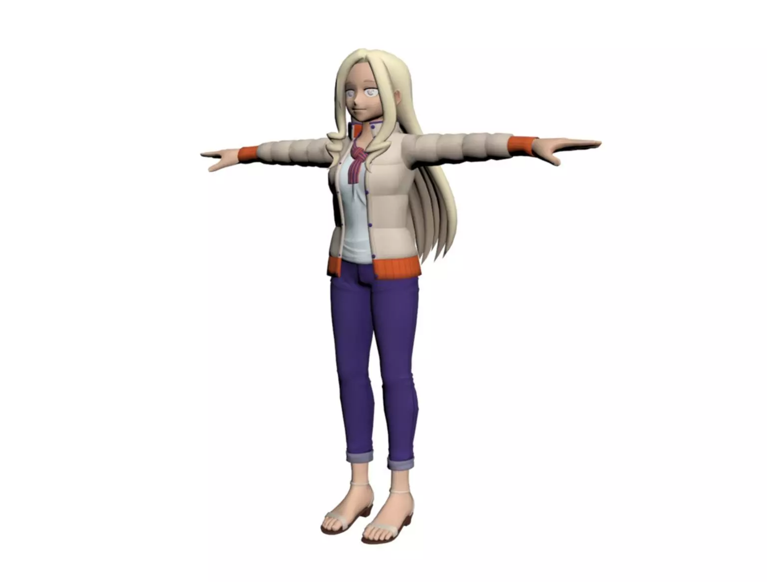 Character Overview: Name: Yu Takeyama Hero Name: Mt. Lady Quirk: Gigantification Role: Pro Hero Known For: Flashy public persona, modeling work, and colossal height when quirked Typical Look (Casual): Glamorous and stylish, often in media or agency scenes when not suited upHead & Face: Long flowing blonde hair with curled ends Violet-colored eyes Thick lashes, often with slightly sultry or confident expressions Models often include blendshapes for blinking, smiling, talking Hair: High-detail models use bone chains or soft-body physics for natural hair motion Often segmented in mobile/console models to simulate bouncecurvier than average female characters) Form-fitting outfit meshes with attention to silhouette and texture detail Depending on source, skirt or coat can be physics-enabled (cloth sim) Textures: Albedo (diffuse), Normal map, Roughness, Metallic, AO PBR (physically based rendering) style in Blender or game engines Makeup and blush included in texture maps for realismFile Formats: .fbx, .3ds, .obj ,.stl,.max,