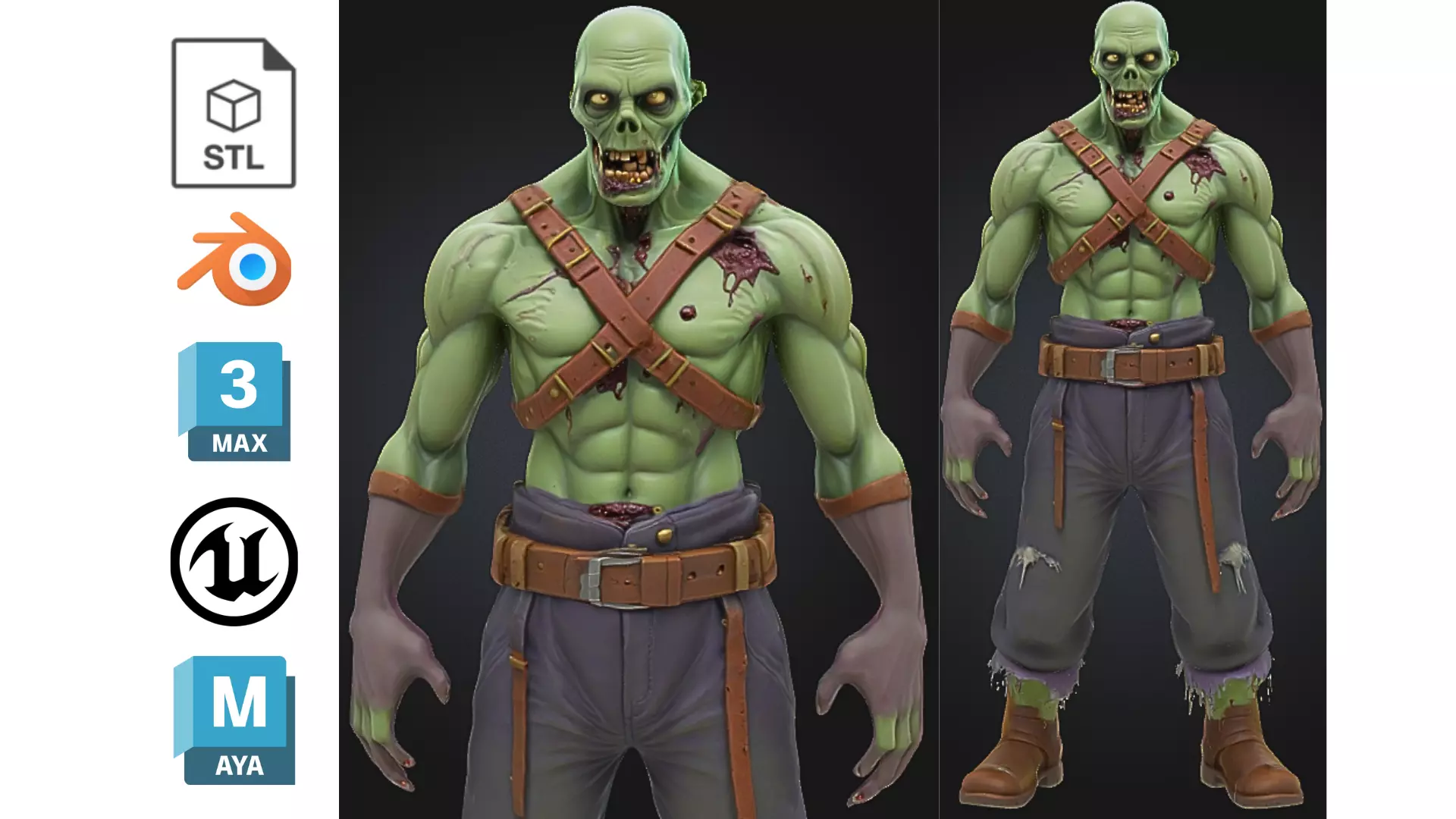 A stylized zombie brute character, perfect for horror, fantasy, or post-apocalyptic games and animations. This hulking undead is designed to serve as a durable melee enemy, background walker, or NPC in stylized or cartoony game worlds.