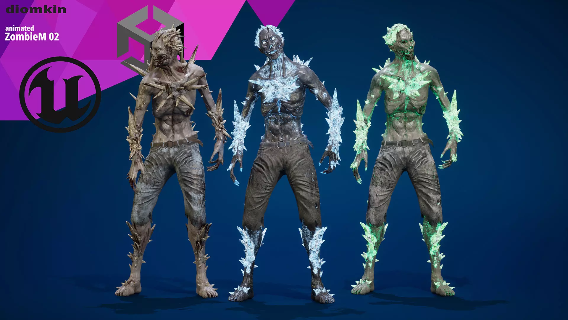 • The ZombieM 02 model contains 3 skins, 6 materials, 39 PBR textures 4096x4096, 22 animations, blendshapes, EpicSkeleton 5.
